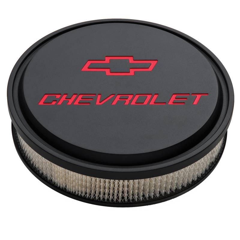 14" Air Cleaner Kit NEW Slant-Edge Air Cleaners are the perfect way to complete your dress-up look in premium Slant-Edge style. Initially six of the most popular styles that include raised and recessed emblems will be released! Whether you have Slant-Edge valve covers, or a set from a different series, these air cleaners will bring your engine look together in head turning fashion. They are supplied with genuine 3" GM air filter elements (GM P/N 6421746, AC Delco P/N A212CW) for maximum airflow. Each kit is supplied with necessary mounting hardware. Technical Note: After installing a new air cleaner, always lower the hood slowly to confirm sufficient clearance visually. Minimum clearance of 3-3/4" is required from the top of the carburetor gasket area to the underside of the hood. For buyers wishing a taller (4-1/32") filter, purchase GM P/N 8997189 (AC P/N A697C). The air cleaner bases are recessed for a low profile appearance, maximum performance and hood clearance. Patented Design.