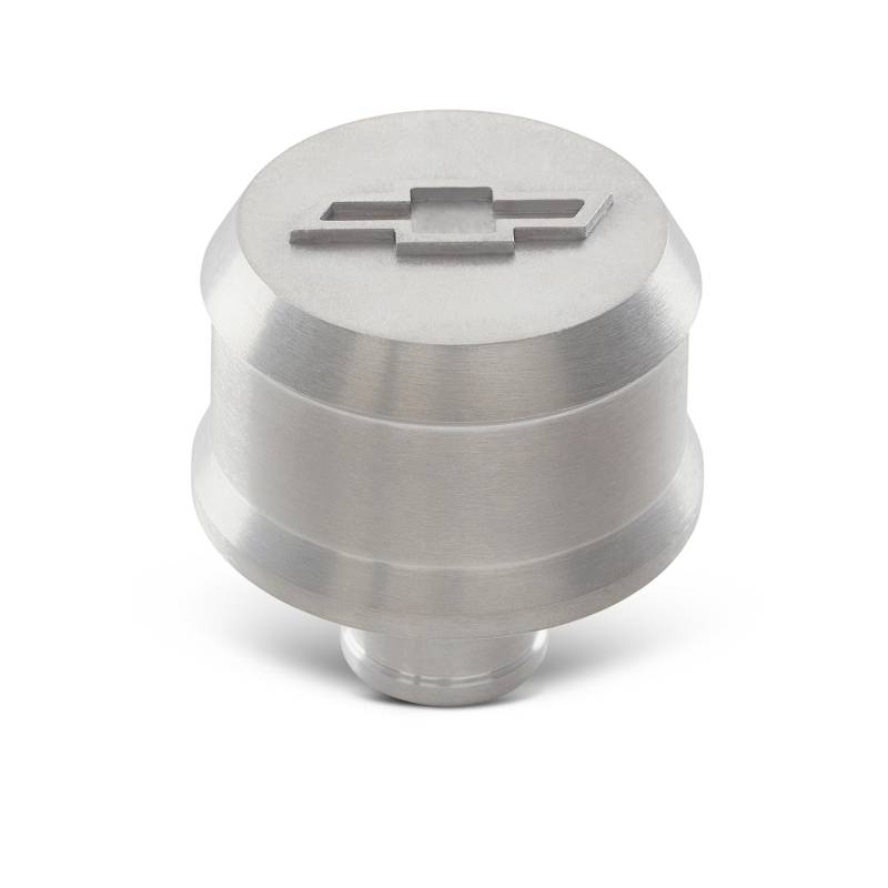 Slant-Edge Aluminum Breather Cap No more stamped steel breather caps for aluminum valve covers! Complete your engine dress-up look with a breather cap that actually matches your look! These new Slant-Edge aluminum push-in breather caps are available in five different finishes, and with just about every Bowtie emblem configuration imaginable: raised and milled, recessed with inlaid paint, the unique recessed/raised blackfield, and even no emblem at all. The vivid 3D Bowtie emblem gives this 2.5 inch diameter breather cap a bold clean look that