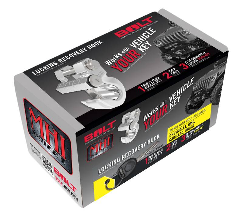 GM Late Model Locking Recovery Hook The BOLT Locking Recovery Hook secures Standard 7/8" Bumper Tabs, Winches and Recovery Ropes and Work With your Vehicle Ignition Key Limited Lifetime Warranty Weatherproof Provides safe and secure recovery ability Rated for 10,000 pounds