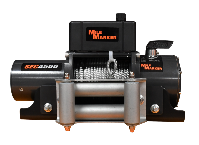 SEC4500 4,500 lb General Purpose Winch The Mile Marker SEC4500 is a compact, high performance utility and trailer winch engineered to deliver dependable 4,500 lb pulling capacity in demanding environments. Designed for car trailers, utility trailers, UTVs, and compact SUVs, the SEC4500 combines strong line pull with low amperage draw and fast line speeds to improve operational efficiency without overloading vehicle electrical systems. Weighing only 51 lb, this winch features a high output series wound motor and rugged heavy duty solenoid for consistent, reliable power. The fully sealed housing is submersible and built to resist water, mud, and snow, making it suitable for harsh weather and recovery conditions. Corrosion resistant stainless fasteners and marine grade remote control connectors further enhance long term durability. The SEC4500 includes a 1/4 in x 79 ft steel cable, roller fairlead, hook, recovery tow strap, mounting plate, and handheld remote control to support versatile installation and operation. A low friction automatic load holding brake integrated into a military grade drum helps maintain secure load control and reduce rollback during pulling. Built for users who demand performance and reliability in a compact footprint, the SEC4500 delivers serious utility capability backed by Mile Marker engineering experience and a reputation for dependable recovery equipment.