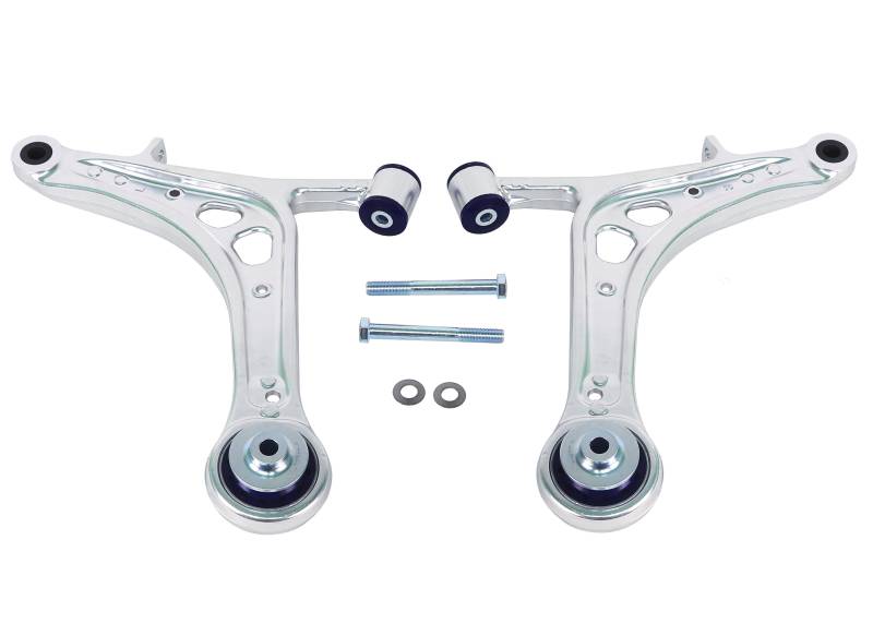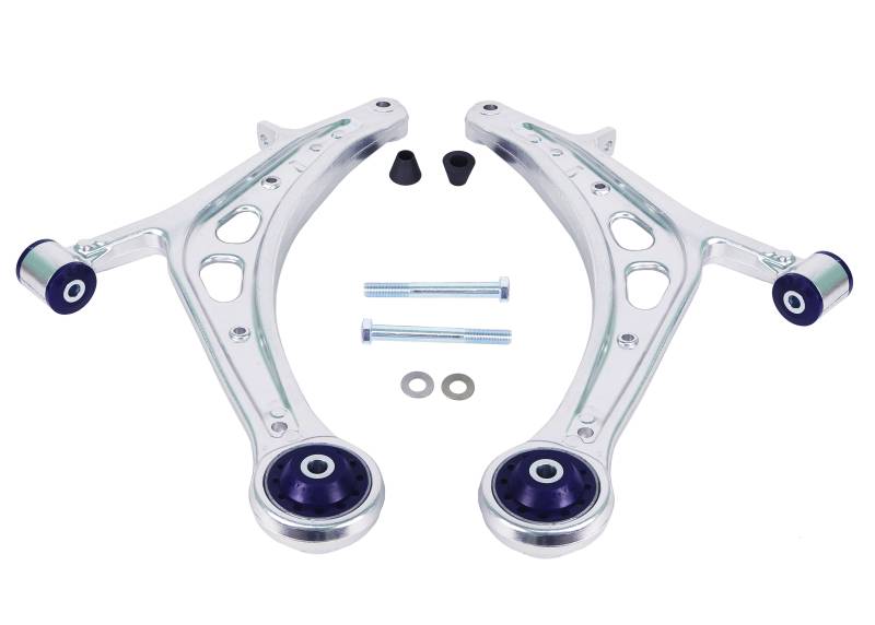SuperPro's ALOY014K offers a number of significant upgrades in a single kit. First the alloy control arms themselves are both lighter and stronger than the steel arms used on WRX models - the ALOY0014K effectively provides an STI-style alloy arm set with upgraded bushings already installed Second; anti-lift geometry. This keeps more of the tire's contact patch in contact with the pavement under acceleration allowing your power to more efficiently get to the ground. Third; SuperPro's proprietary polyurethane compound and DuroBall compound bushing used in the forward and rearward bushing assemblies offering a massive upgrade over the soft and heavily voided OEM bushings. This reduces deflection and movement resulting in more consistent tire performance - better traction, better grip and reduced wheel hop. The smaller inner bushings at the rear also features a bonded steel shell to reduce any friction during suspension travel to allow your springs and dampers to deliver the intended performance. Fourth; this kit is complete - including required hardware and new ball joint bosses avoiding the issue with corrosion often making it difficult or impossible to re-use the originals. Why Standard Geometry? If you're looking for additional positive caster from this control arm upgrade - see our ALOY0015K kit that includes a double offset bushing design to increase positive caster. The standard geometry kit came about for customers who wish to run a significantly lower ride height than stock and/or a much wider wheel and tire package - or simply a more aggressive (numerically lower) wheel offset. The additional caster featured in the ALOY0015K will move the front wheel forward in the wheel opening slightly - normally not an issue, but in cars running very low ride heights, extremely aggressive wheel/tire combinations or some combination of the two - this can cause the tires to rub on the inner fender liner at or near full steering lock (like when backing out of a parking spot. For these customers, we have introduced the ALOY0014K without the additional caster built in. For a complete upgrade - look to our TRC0002 roll center and bump steer correction kit that further optimizes front end geometry in lowered cars and refreshes your ball joints and tie rod ends at the same time