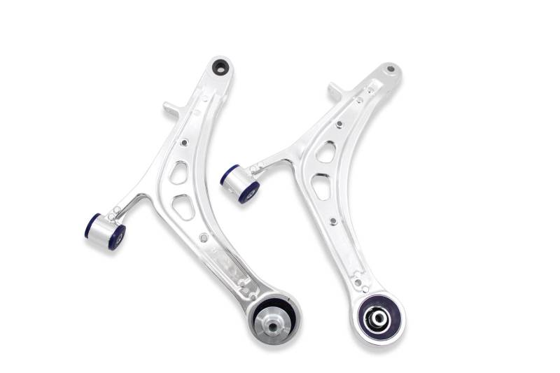 SuperPro's ALOY0017K offers a comprehensive DIY performance upgrade for your2015-2021 Subaru WRX or WRX STI Featuring pre-installed SuperPro bushings in the forward position of the arm and SuperPro's caster offset DuroBall bushing assembly at the rear the kit allows a bolt-on alloy arm, upgraded bushings and optimized geometry with additional caster and anti-lift geometry. The alloy arm brings strength, rigidity and a small weight savings relative to the OE steel arms. The geometry upgrades offer improved tire contact patch at the front end when accelerating, cornering and braking - working the tire more effectively and efficiently to generate greater grip and traction. The kit also includes new OEM style ball joint bosses to facilitate an easier installation (the OEM pieces often seize onto the OEM ball joints on the OEM arms)