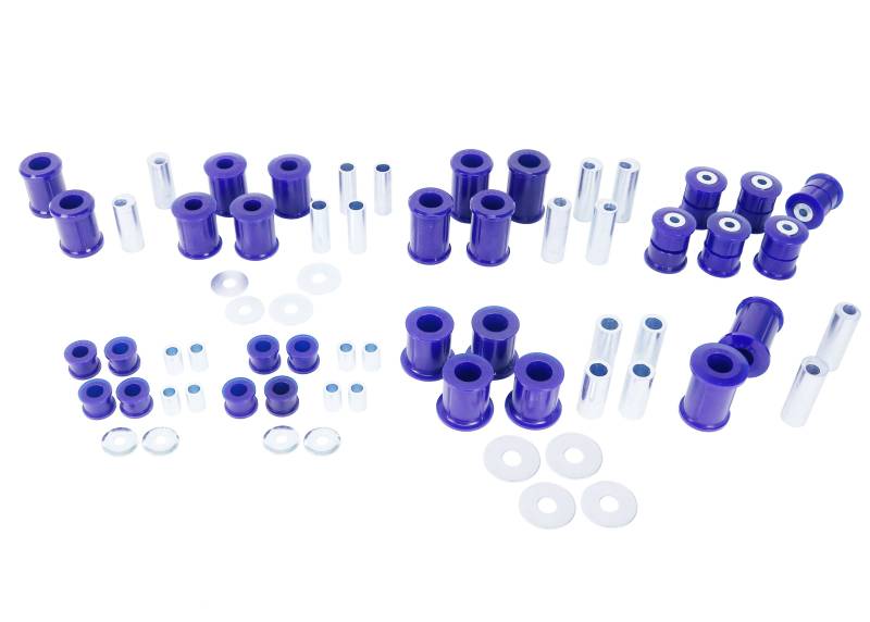 The KIT132NAK is SuperPro's alignment-adjustable suspension bushing kit for the NA Miata. Including bushings for the front upper and lower control arms, rear upper and lower control arms as well as the front and rear sway bar links. (If you're running aftermarket links KIT132NBK includes the same control arm bushings but leaves out the sway bar link bushings). This kit includes a combination of 'standard' non-adjustable bushings and a selection of offset/adjustable bushings to facilitate camber and caster adjustment at the front end and camber adjustment at the rear. The kit will upgrade the design and materials over the OEM bushings for superior handling, greater responsiveness, and a massively extended service life. If you do not require the ability to adjust front camber and caster and rear camber we also offer that option in our KIT131NAK Kit contains: Front Control Arm Lower-Inner Front Bush Kit - Double Offset Front Control Arm Lower-Inner Rear Bush Kit - Double Offset Front Control Arm Upper-Inner Bush Kit Front and Rear Sway Bar Link Bush Kit Rear Control Arm Lower-Inner Bush Kit - Double Offset Rear Control Arm Lower-Outer Bush Kit Rear Control Arm Upper-Inner and Outer Bush Kit