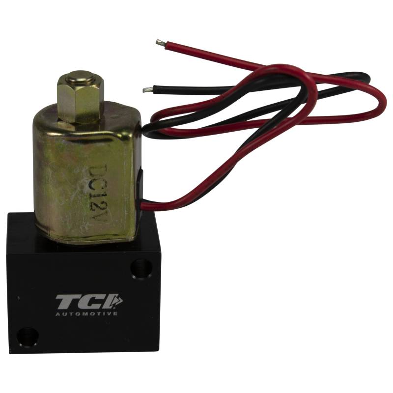 Electric Brake Shut-Off . The TCI Electric Brake Shut-Off allows the driver to electrically shut off the right front brake caliper to enhance corner entry handling in dirt circle track racing applications. The easy-to-install solenoid mounts directly into the brake line, anywhere between the master cylinder and caliper. A flip of the switch activates the 6061-T6 aluminum encased, continuous-duty solenoid. The solenoid then blocks fluid flow to the right front caliper, eliminating the common “push or tight” condition experienced under corner entry braking.