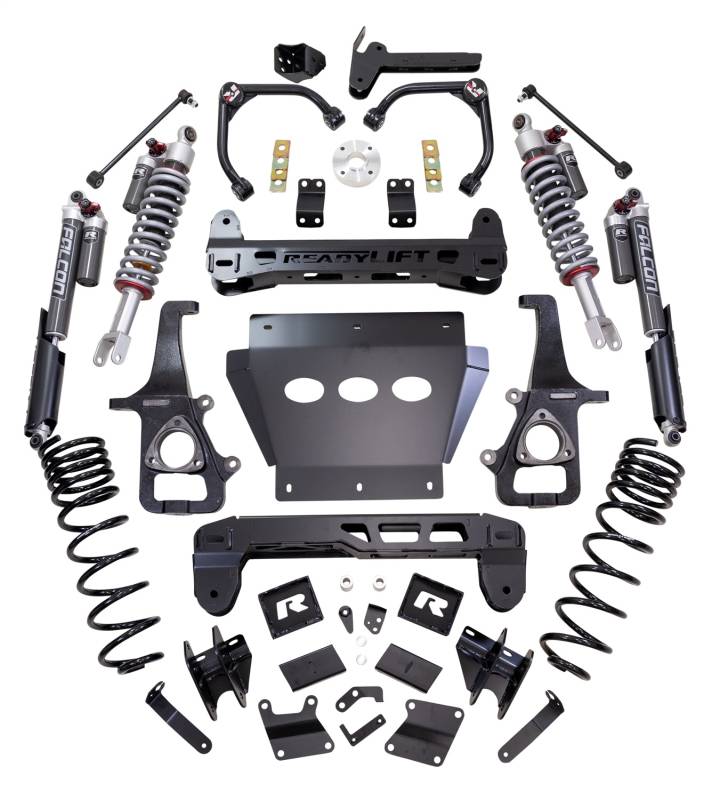 ReadyLIFT is excited to announce our all-new 6” MAX3.3 Suspension Systems delivering unmatched performance, control, and capability for the 2019-2024 Ram 1500. On the current generation Ram 1500, the new MAX3.3 Suspension System provides a 6” lift specifically engineered with the all-new Falcon 3.3 series struts and shocks. To complement the advanced Falcon strut/shock architecture, our engineers also developed upgraded DOM tube steel upper control arms with corrected ball joint angles for greater strength and articulation.This Ram 1500 MAX3.3 system pairs front 3.3 Fast Adjust struts with rear adjustable piggyback shocks. The new 3.3 Falcon’s are Fast Adjust Dampers offering a wide range of adjustability for specific terrain and/or handling characteristics with two separate knobs to tune to your preference. Falcon Performance Shocks improve performance and comfort regardless of the terrain. The versatility of these systems makes them ideal for daily driving, off-road excursions, and tow/haul duties. This 6" lift kit adopts all the important elements of a premium lift kit to ensure the truck rides and drives remarkably. The longer rear sway bar end links, heavy-duty cast iron knuckles, and unusually robust steel skid plates are just a few of the ingredients contributing to an amazing driving experience on up to 37x12.50 tall tires on 9" wide wheels with 0 offset.\nFeatures and Benefits:3.3 Fast Adjust Dampers offer a wide range of adjustability for specific terrain and/or handling characteristics with two separate knobs to tune to your preference.\n3-Position Fast Adjust Knob for Soft, Custom, and Firm Compression. Soft mode allows a partial bypass of the main piston for a softer ride\n8-Position Micro Adjust Dial offers refined damping adjustments\nReservoir design increases nitrogen to oil ratio for consistent damping over wide temperature ranges.\nHard Anodized Large Bore 6061-T6 Aluminum Shock Body for impact and corrosion resistance as well as increased oil volume for consistent performance.\nVOD (Volume Optimized Damping) features a digressive linear piston for quicker ramp-up for reduced body roll and an overall increase in damping to reduce bottom out when pushed to the limit.\nRed Line high VI shock oil for consistent performance across all temperatures from -50F to 450F with anti-wear and lubricity agents.\nDOM tube steel upper control arms with Proprietary Heavy-Duty High-Angle Ball Joint.\nHeavy-duty fabricated steel components utilizing 3/16? and 1/4? steel plate\nFull-coverage differential skid plate constructed from 3/16? steel plate\nTire size 37x12.50R20 with a 20×9” with a 0 offset wheel\nMax tire with trimming 37×12.50” with a 20×10” with a -18 offset wheel\nNote: RAM 1500 with factory 22" wheels requires a larger bore knuckle assembly due to larger wheel bearing assembly. Vehicles with 22" factory wheels should use #44-1961 or install replacement standard wheel bearing assemblies (not included). If installing this kit any Off-Road Group Package‚ equipped truck, ReadyLIFT recommends foregoing the front preload spacer installation - the lifted vehicle will sit about 1/2" front high with the preload spacer installed or 3/8" low without the preload spacer. This kit is NOT compatible with (1) adjustable models equipped with air suspension- or (2) Ram TRX.
