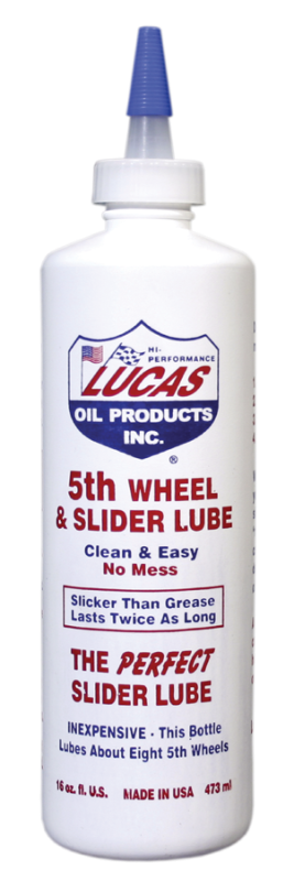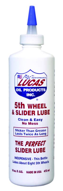 5th Wheel Lubricant Lubrication is usually done with only a thin film of lubricant and 5th Wheels are no exception. No matter how much grease you pile on a 5th wheel, only a thin film remains after the weight of a trailer settles on it. So why not put on a thin film to start. Lucas 5th Wheel & Slider Lube is a clean, inexpensive alternative to grease. It has a film strength many times stronger than grease. It is slicker than grease, and it's waterproof. Since it is not a grease, it will not leave gooey soap behind after the lubricant is exhausted. This performance feature will help minimize maintenance issues in the lock mechanisms associated with the crusty, cruddy soap remaining in the system. Snip the tip on the 16 oz. bottle and string over the dry spot on the 5th Wheel. On slider rails, squeeze the bottle as you drag the tip down the slider rail. One thin string is all that is necessary. Move the trailer back and forth on the slider rail to spread the lube. This should provide months of easy sliding. Remember... dry 5th wheels are a major cause of front tire wear, front end wear, spring bushing wear and jack-knifing.