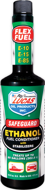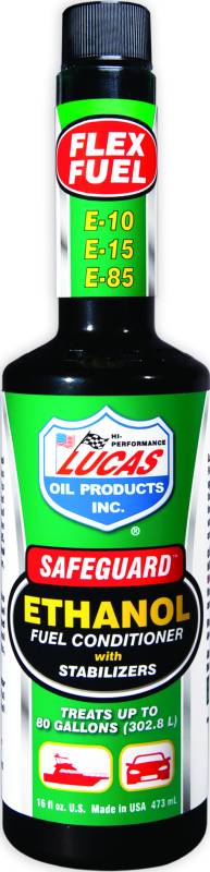 Safeguard Ethanol Fuel Conditioner Lucas Safeguard?Ethanol Fuel Conditioner and Stabilizer was developed to specifically address issues associated with using ethanol based fuels. This applies to E-10, E-15, E-85, pure ethanol and any mixtures in between, including gasoline. Our product is completely soluble in all ethanol fuels and will not harm filters. Our product contains effective additives to prevent rust and corrosion associated with the use of ethanol fuels. Safeguard? cleans injectors, valve seats, combustion chambers and other critical fuel components. It contains effective oxidation inhibitors to stabilize fuel and prevent varnish and gum formation in ethanol and gasoline. It works to combat deposits and protects your engine oil lubricants from the harmful effects of alcohol combustion. Safeguard? treats up to 80 gallons (302.8 liters) of ethanol fuel. One ounce treats five gallons of ethanol fuel. Recommended for use in automobiles and marine applications. Our new 5.25 oz bottle treats up to 25 gallons (94.6 liters) of ethanol fuel. NOT RECOMMENDED FOR DIESEL APPLICATIONS.