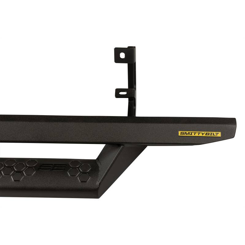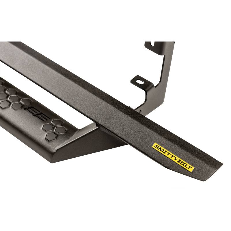 Smittybilt's Angular Drop Steps match the newest generation of vehicle styling. This design offers a clean look while protecting the side of the vehicle. Its wide step and unique hexagon design enhances the look of your vehicle while giving you a large safe platform to step in and out of your vehicle. Our light black textured finish provides durability and protection against all elements and provides . Quick and easy install. Smittybilt angular drop steps are backed by our industry leading lifetime structural and 5 year finish warranty. Large 13" stepping area at every door, measuring 4" deep Textured black finish Cab length Limited Lifetime Structural Warranty / 5 Year Finish Warranty Fits 2019-2024 Chevy Silverado 1500 - Crew Cab