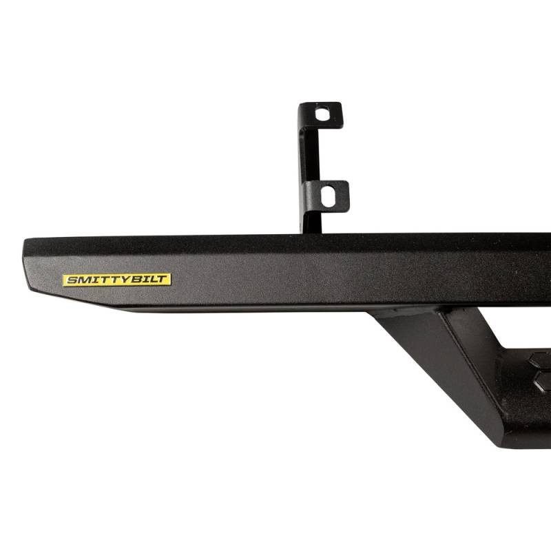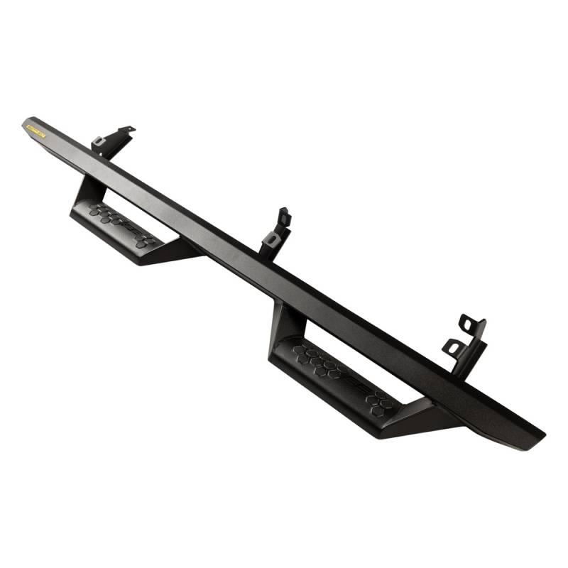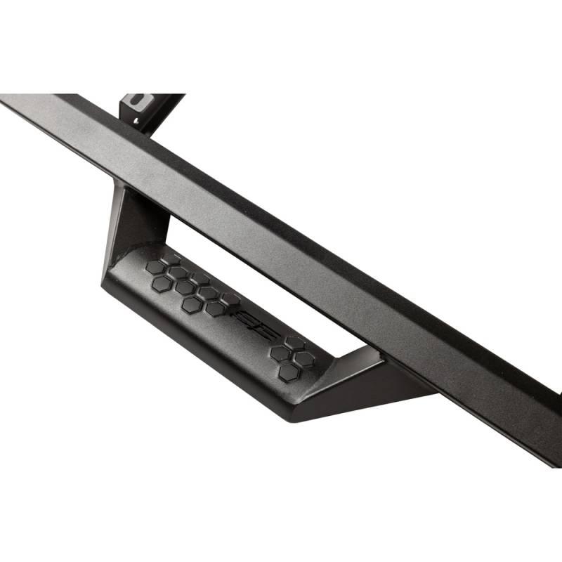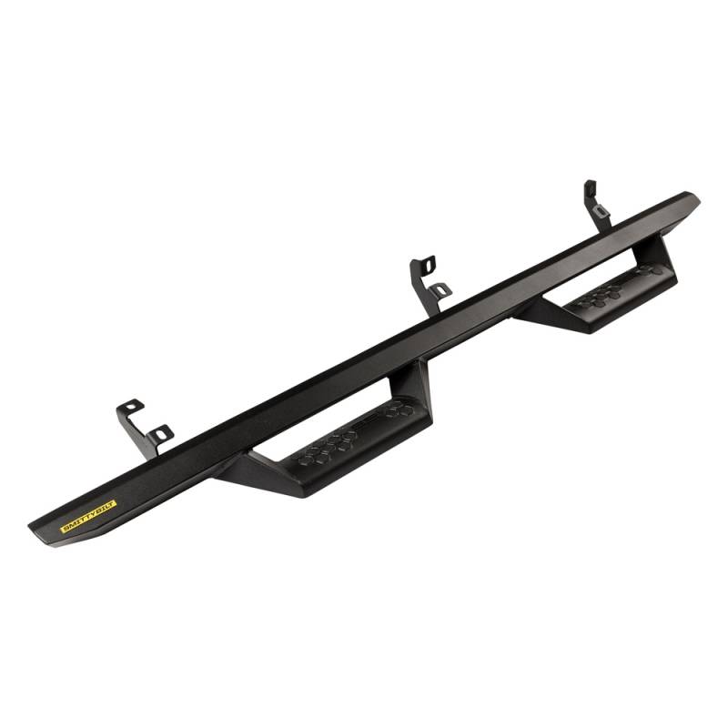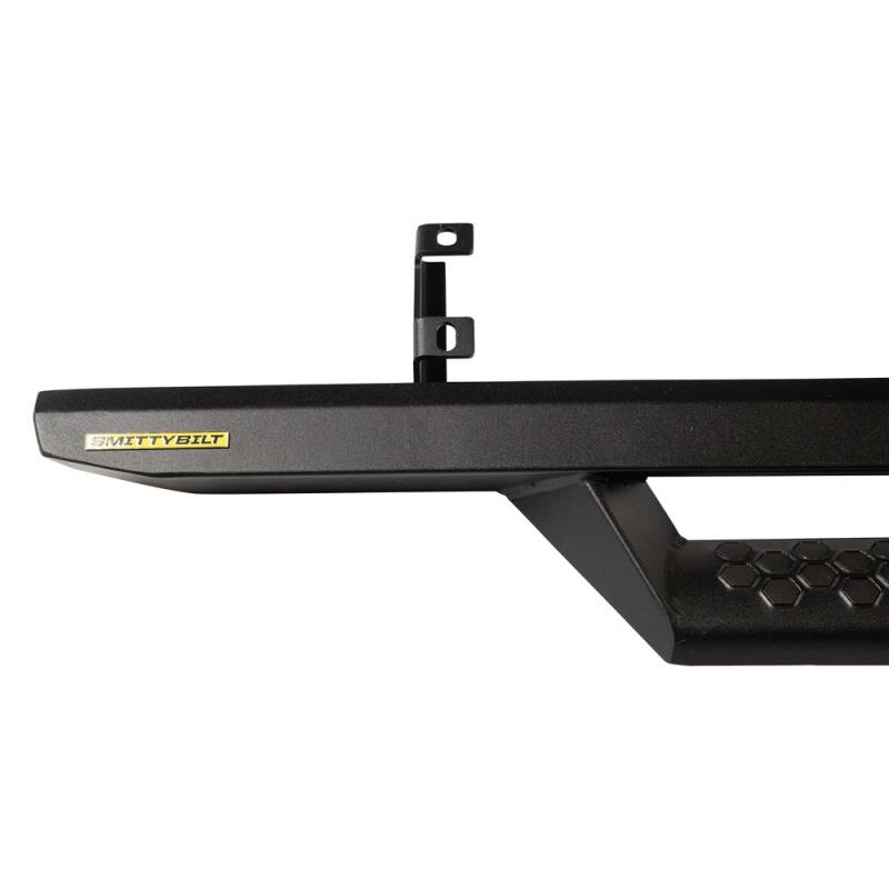 Smittybilt's Angular Drop Steps match the newest generation of vehicle styling. This design offers a clean look while protecting the side of the vehicle. Its wide step and unique hexagon design enhances the look of your vehicle while giving you a large safe platform to step in and out of your vehicle. Our light black textured finish provides durability and protection against all elements and provides . Quick and easy install. Smittybilt angular drop steps are backed by our industry leading lifetime structural and 5 year finish warranty.