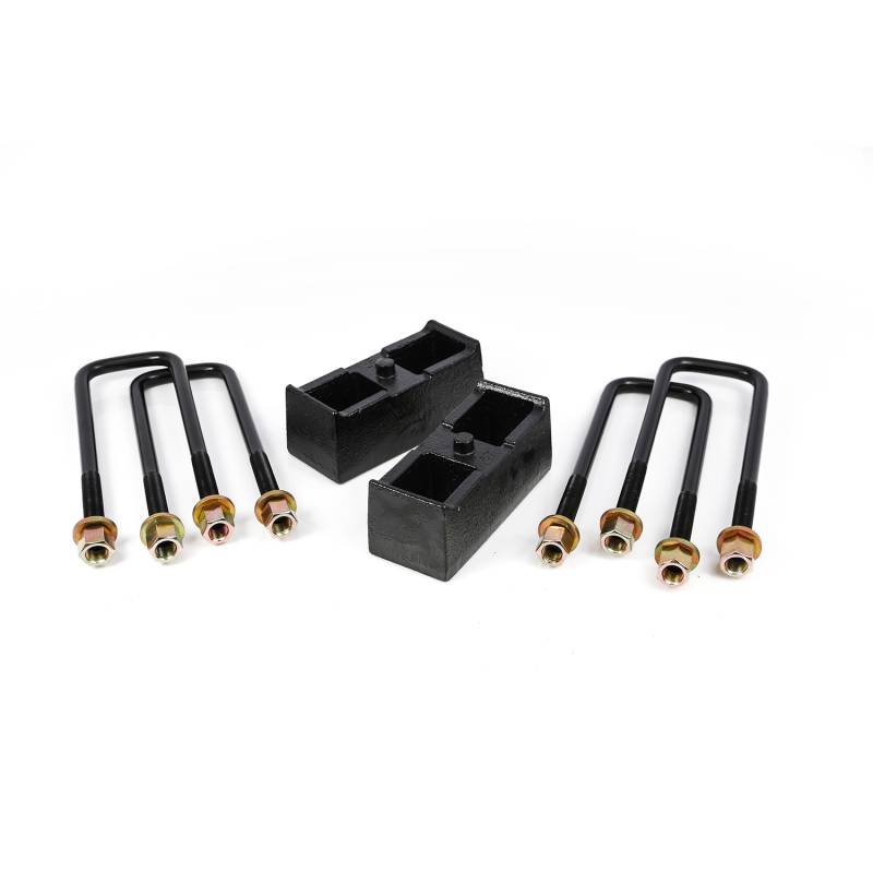 ProComp 2 Inch rear block kit for 1999-2021 Chevy Silverado / GMC Sierra 1500 2WD and 4WD trucks. Provides either 2" of rear lift for trucks without a factory rear block, or 1" of lift if your truck has a factory rear block. Comes complete with vehicle specific u-bolts and hardware. Adds a nice rake for towing or hauling additional weight in the bed. Easy to install. Does not require any permanent modifications.
