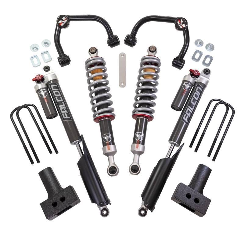 ReadyLIFT now offers a new premium 3.5" SST2.1 series lift kit for the 2021-2025 Ford F-150 4WD! The 62-21440 SST2.1 Lift Kit provides a great lift solution to achieve a mild yet aggressive lifted stance while maintaining important factory ride and handling characteristics. The new 3.5” lift kit incorporates our all-new Falcon 2.1 series front replacement strut and rear shock system that delivers an incredible ride quality and opens the wheel wells up to increased wheel and tire sizes with the 3.5” front and a 2.5” rear lift over the stock ride height.The Falcon 2.1 system pairs front monotube struts with rear adjustable piggyback shocks. SST 2.1 allows adjustment to the suspension – select a tune for daily, sport, or work duties with Falcon 2.1 Sport Tow/Haul Shocks. The easy-to-use 3-position Fast-Adjust settings include Sport/daily, Moderate Tow/Haul, and Heavy Tow/Haul. Falcon Performance Shocks improve performance and comfort regardless of the terrain. The versatility of these systems makes them ideal for daily driving, off-road excursions, and tow/haul duties. To complement the advanced Falcon strut/shock architecture, our engineers also developed upgraded DOM tube steel upper control arms with corrected ball joint angles for greater strength and articulation, complete with (4) alignment cam plates. The ReadyLIFT 3.5" SST2.1 Kit is exclusively engineered for the new 2021-2025 Ford F-150 4WD pickups. The maximum size tire/wheel fitment for use with this kit (without trimming) is a 295/60R20 on a 9” wide and +18 offset wheel. 3.5” front lift with a 2.5” rear blocks Allows for up to 295/60R20 on a 9" wide and +18 offset Fit up to a 35"x12.5" wheel 20"x9" with 0 offset with minor trimming DOM tubular steel Upper Control Arms with market-best heavy-duty high-angle proprietary ball joint. Unmatched curb-appeal and rugged mid-size truck capability delivered in an affordable yet innovative Smart Suspension Technology “no-cut” lift kit