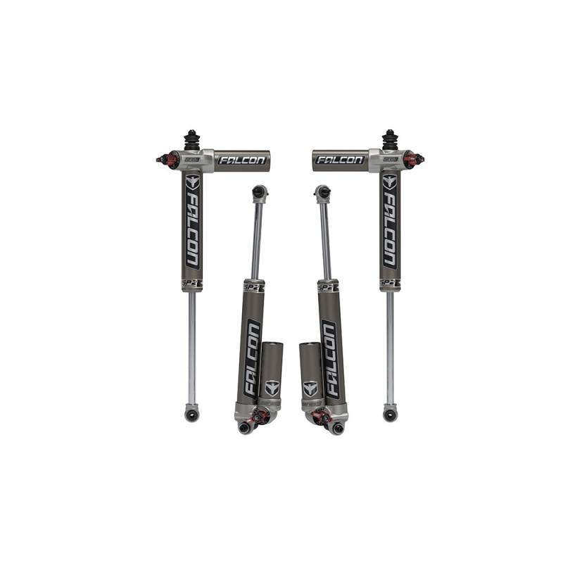 Falcon SP2 3.3 Fast Adjust Piggyback Shocks offer a wide range of adjustability with their easy to use 3-Position Fast Adjust Knob. Settings include Soft, Custom, and Firm. The Custom setting incorporates an 8-Position Micro Adjust Dial for more precise tuning between Soft and Firm. “High-Value Performance” is the driving force behind our vehicle-specific dampers for Jeeps, trucks, and SUVs. These Jeep-specific shock absorbers deliver increased stability, improved ride quality, and comfort for daily driven vehicles as well as race-inspired performance, handling, and stability for off-road rigs.