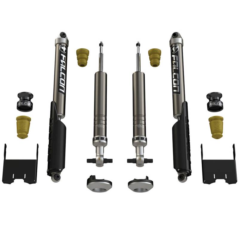 Falcon Performance Shocks improve performance and comfort regardless of the terrain. Sport Shock Systems feature front monotube shocks and rear monotube or piggyback shocks. These compact and affordable shocks are ideal for daily driving and off-road excursions. Falcon Shock Leveling Systems provide multiple ride heights to level the front end and/or compensate for the additional weight of a winch or other accessories. ?High-Value Performance" is the driving force behind our vehicle-specific dampers for Jeeps, trucks, and SUVs. We don't re-valve existing shocks (like other companies); we engineer complete shock absorber systems that improve the overall performance of your truck or SUV both on and off road and while towing. Falcon Performance Shocks by TeraFlex. Sport Shocks: Sport Shocks increase stability and control as well as improve ride quality and comfort both on and off-road in a compact and affordable package Front monotube shocks paired w/ rear monotube or piggyback shocks Optimized tuning for on- and off-road driving ideal for daily driven vehicles and off-road excursions as well as the serious enthusiast wanting a consistent, controlled feel through all driving conditions Front Leveling Shocks: Front leveling shocks w/ multiple snap ring grooves provide a range of height adjustment