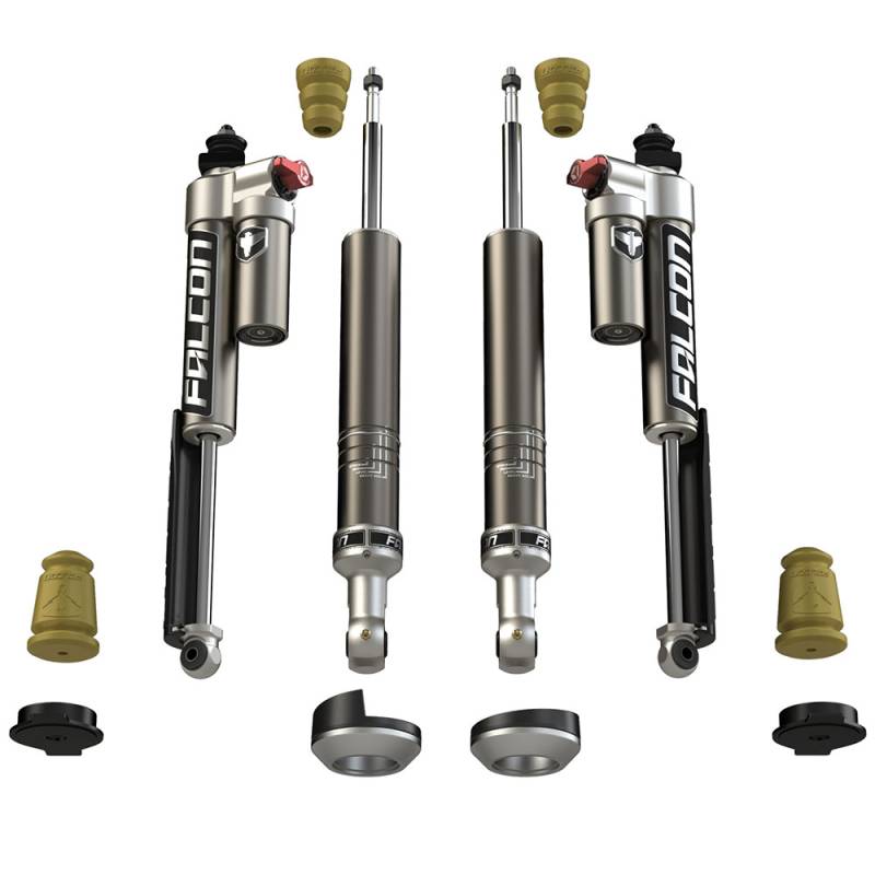 Adjust your suspension tuning for sport or work duties with Falcon Sport Tow/Haul Shocks. These systems pair front monotube shocks with rear adjustable piggyback shocks. The easy-to-use 3-position Fast Adjust Knob's settings include Sport, Moderate Tow/Haul, and Heavy Tow/Haul. Falcon Performance Shocks improve performance and comfort regardless of the terrain. The versatility of these systems makes them ideal for daily driving, off-road excursions, and tow/haul duties. Falcon Shock Leveling Systems provide multiple ride heights to level the front end and/or compensate for the additional weight of a winch or other accessories. ?High-Value Performance" is the driving force behind our vehicle-specific dampers for Jeeps, trucks, and SUVs. We don't re-valve existing shocks (like other companies); we engineer complete shock absorber systems that improve the overall performance of your truck or SUV both on and off road and while towing. Falcon Performance Shocks by TeraFlex. Sport Tow/Haul Shocks: Sport Tow/Haul Shocks increase stability and control as well as improve ride quality and comfort both on and off-road in a compact and affordable package Front monotube shocks w/ optimized tuning for on- and off-road driving Rear adjustable piggyback shocks w/ 3-position Fast Adjust Knob for large damping adjustments Rear settings include: Sport, Moderate Tow/Haul, Heavy Tow/Haul ideal for daily driving, off-road excursions, and tow/haul duties as well as the serious enthusiast wanting a consistent, controlled feel through all driving conditions Front Leveling Shocks: Front leveling shocks w/ multiple snap ring grooves provide a range of height adjustment Rear Piggyback Shocks: Piggyback design increases oil and gas capacity for reduced heat Flows 6x more oil than restrictive reservoir hose designs Eliminates common leakage issues found in banjo and swivel fittings
