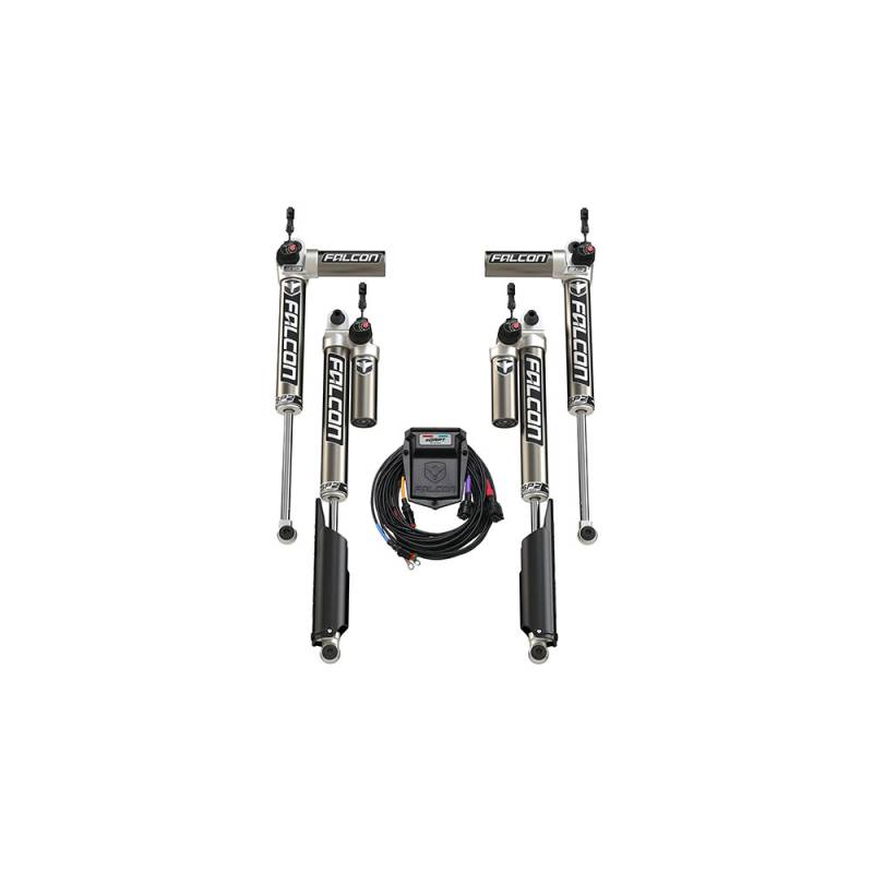 Gain more control over your suspension tuning with the Falcon SP2 3.5 aDAPT Piggyback Shocks! In addition to the 8-Position Dial, these shocks can be programmed to automatically switch from Soft to a manually preselected Firm setting depending on terrain. The aDAPT Control Module?s 3-position In-Cab Switch includes Soft, Firm, and Auto settings. SP2 3.5 aDAPT: SP2 3.5 aDAPT Piggyback Shocks offer a wide range of adjustability for specific terrain and/or handling characteristics In Auto Setting, the aDAPT Control Module automatically switches from Soft to a manually preselected Firm setting based on driver selectable minimum ?G" threshold The desired Firm setting is controlled manually by the 8-Position Dial aDAPT Control Module adjustment parameters: forward acceleration, lateral acceleration, braking Each parameter is set separately Firm mode duration can be set between 1-5 seconds 3-position In-Cab Switch settings include: Soft, Firm, Auto Can also be manually adjusted from Soft to preset Firm setting Using the Falcon App, multiple presets can be created and used for different driving conditions Calibrate aDAPT Control Module for various install orientations SP2 Mode Adjust tunes compression and rebound for Soft or Performance settings Ideal for daily driven Jeeps as well as the serious enthusiast wanting automatic control and advanced tuning options from the driver seat JL: JL corner-specific shock absorber w/ race-inspired performance Front lower offset eyelet design provides maximum shock body to frame clearance during articulation Rear roost guards prevent shock shaft damage from rocks kicked up by the tires Piggyback: Piggyback design increases oil and gas capacity for reduced heat Flows 6x more oil than restrictive reservoir hose designs Eliminates common leakage issues found in banjo and swivel fittings Front shocks? unique horizontal piggyback reservoir increases tire clearance