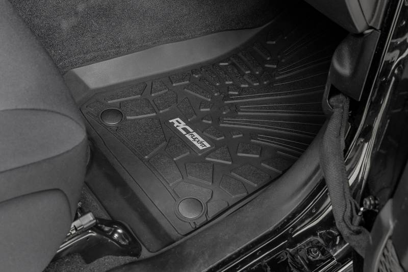 Introducing Flex-Fit floor mats ΓÇö the ultimate enhancement for your truck's interior and built tough to handle any challenge. Crafted from premium rubber-like material, these mats are as durable as they come, perfectly tailored to fit your truck's unique shape for a seamless finish.\ Stock floor mats just don't cut it for adventurers. They get trashed by mud, don't hold up to spills, and leave your carpets a mess. Give your ride the all-weather protection it deserves with Rough Country's Flex-Fit Floor Mats, the perfect solution for keeping your vehicle clean and protected.\ All-Weather Protection: Engineered to fit your vehicle perfectly, these mats provide top-notch defense against snow, mud, sand, saltwater, and more.\ Spill Saver Lip: Don't sweat the spills! Our mats feature a Spill Saver Lip that prevents liquids from reaching your carpet, so you can enjoy your coffee on the go without worry.\ Non-Slip, Textured Surface: Stay in control no matter the terrain with our mats' non-slip, textured surface, designed to keep your feet firmly planted while driving.\ Easy to Clean and Maintain: Cleaning up is a breeze! These mats are detachable and easy to clean, so you can spend less time on maintenance and more time hitting the road.\ Premium Materials: Constructed from a rubber-like TPE material, these mats are built to withstand extreme temperatures without cracking or warping. They will stay flexible and functional for the long haul.\ Effortless Installation: Forget wrestling with bulky mats. Flex-Fit Mats slide right into place for a quick and frustration-free installation.\ Upgrade your truck's defense against the elements with Rough Country's Flex-Fit Floor Mats. They'll keep your carpets looking fresh and give you peace of mind on every adventure.