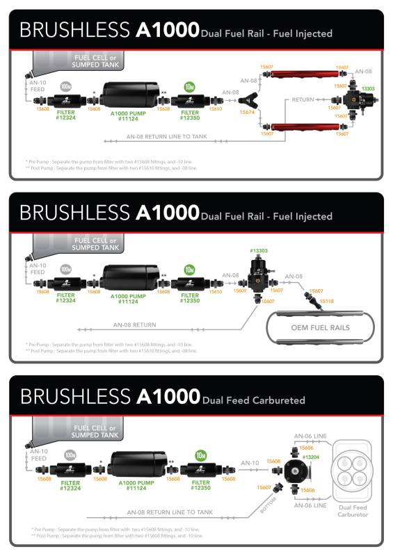 The market leader in fuel delivery systems and components, Aeromotive introduces its first brushless fuel pump series. The same A1000 Fuel Pump the world has come to trust and depend on, now available with the latest brushless-motor technology. Built for up to 65 psi of sustained pressure, featuring our bedrock solid roller vane design that primes easily, reduces friction and improves efficiency. ORB-10 inlet and outlet ports. For EFI applications use regulator P/N 13303 or P/N 13139. For carbureted applications use regulator P/N 13204 or P/N 13304. Perfect for blow-through carbureted engines up to 1200 FWHP. Brushless motors employ sensors to monitor rotor angle to provide faster and more reliable phase shifting, producing more torque capacity and motor efficiency. Instead of the armature rotating, in a brushless motor the magnets rotate around the armature and the motor controller manages the phase shift to keep the motor rotating under load (load is related to pressure in a fuel pump). With more torque per watt and a higher torque to weight ratio, brushless motors produce lower noise and deliver higher reliability. With a higher level of efficiency, down to fractions of a second in design speed control, the new Aeromotive brushless fuel pumps provide precise control of fuel pump RPM as pressure rises, better maintaining pump RPM and flow, producing a flatter flow curve. Tight tolerances result in less current draw, less heat and extended life. Now there is the ability to upgrade to a premium brushless pump for faster, more reliable and uninterrupted fuel delivery with less power consumption and potential for wear or failure.