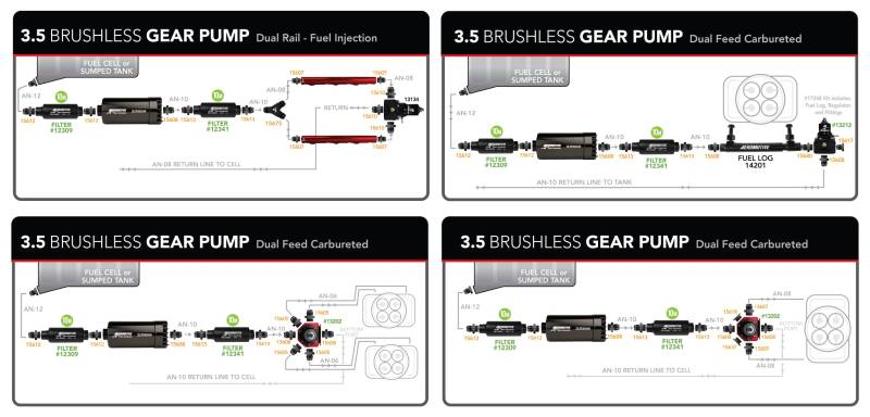 The market leader in fuel delivery systems and components, Aeromotive introduces its first brushless fuel pump series. The 3.5 Brushless Gear pump provides the Pro-Series Fuel Pump performance the world has come to trust and depend on, now available with the latest Spur-Gear pumping mechanism and brushless-motor technology. Built for up to 90 psi of sustained pressure, this new pump supports Pro-Series flow at higher pressures with minimal drop in flow. This new brushless spur-gear pump is able to move more fuel and sustain higher pressures without failure. ORB-12 inlet and ORB-10 outlet ports. For EFI applications use regulator P/N 13134 or P/N 13305. For carbureted applications use regulator P/N 13202 or P/N 13212. Capable of 90-PSI continuous operating pressure, 150 PSI peak pressure, base plus boost. Perfect for blow-through carbureted engines up to 2,000 FWHP. Brushless motors employ sensors to monitor rotor angle to provide faster and more reliable phase shifting, producing more torque capacity and motor efficiency. Instead of the armature rotating, in a brushless motor the magnets rotate around the armature and the motor controller manages the phase shift to keep the motor rotating under load (load is related to pressure in a fuel pump). With more torque per watt and a higher torque to weight ratio, brushless motors produce lower noise and deliver higher reliability. With a higher level of efficiency, down to fractions of a second in design speed control, the new Aeromotive brushless fuel pumps provide precise control of fuel pump RPM as pressure rises, better maintaining pump RPM and flow, producing a flatter flow curve. Tight tolerances result in less current draw, less heat and extended life. Now there is the ability to upgrade to a premium brushless pump for faster, more reliable and uninterrupted fuel delivery with less power consumption and potential for wear or failure.\nAeromotive Inc. is a true high performance aftermarket manufacturer specializing in fuel delivery and fuel delivery components. Utilizing aerospace tolerances and procedures, three generations of track experience, and a meticulous approach to engineering, Aeromotive Fuel Systems has become the absolute pinnacle of performance fuel delivery.