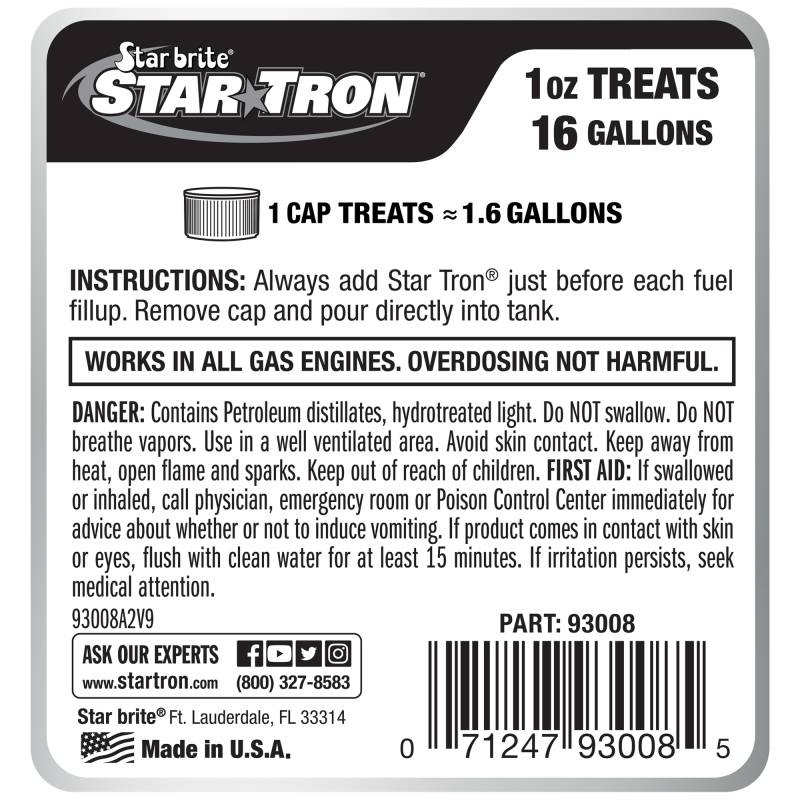 Introducing Star Tron Enzyme Fuel Treatment - the revolutionary fuel additive that will take your engine's performance to the next level! Whether you're using ethanol-blended fuel or ethanol-free gasoline, or if your engine has been sitting idle for months or used every day, Star Tron's unique enzyme technology ensures that your engine will start easily and run smoothly every time.\nStar Tron is a multifunctional additive that works in all engines and fuels and is more than just a fuel stabilizer for engine storage. Its powerful enzyme technology helps to restore lost octane in old, sub-spec fuel while removing gum, carbon deposits, and varnish build-up throughout the fuel system so you can be sure that your engine will always perform at its best year-round. Star Tron cures and prevents most ethanol problems, so you can enjoy your engine worry-free.\nStar Tron also helps prevent phase separation by dispersing water throughout the fuel as submicron-sized droplets that are safely eliminated while the engine operates. Poor combustion results in wasted fuel, smoke, and exhaust emissions. Star Tron not only improves performance and fuel economy but also reduces smoke and other emissions that are harmful to our health and our environment.\nStar Tron is ideal for all engines, including cars, trucks, boats (2-cycle & 4-cycle), motorcycles, ATVs, lawn mowers, generators, heavy equipment, snowmobiles, RVs, weed eaters, personal watercraft, and anything else that uses regular gas, ethanol blends, ethanol-free, rec fuel, rec-90, or pre-mix fuels. With Star Tron, you can be confident that your engine will run smoothly and efficiently, no matter the application.\nSo why wait? Get the best-selling, highest-rated ethanol fuel treatment + fuel stabilizer + gasoline stabilizer on the market today! Choose Star Tron Enzyme Fuel Treatment and experience the ultimate engine performance. ADD TO CART now and see the difference for yourself!\nUsing Star Tron Concentrated Formula #930 is easy! Simply add 1 fl. oz. (30 ml) for every 8 gallons (30 L) of gas as an initial dosage, and then add 1 fl. oz. (30 ml) for every 16 gallons (60 L) of gas as a refill. And the best part? Unlike other stabilizers, Star Tron can be mixed with any other fuel additive without worry. There is no need to know the exact amount of fuel in the tank, or the need for expensive measuring bottles because Star Tron is fuel-based so overdosing is not harmful.