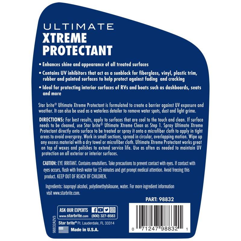 Unlock the ultimate protection and shine for your RVs, boats, and outdoor gear with STAR BRITE Ultimate Xtreme Protectant. This advanced formula is enriched with powerful UV inhibitors, acting as a sunblock to shield fiberglass, gel-coat, carbon fiber, vinyl, plastic, rubber, and finished leather against fading and cracking. Its anti-static finish not only dries clear but also enhances the shine of treated surfaces while repelling dirt and stains without leaving any oily residue. Ideal for interior and exterior use, it's perfect for dashboards, seats, and more, providing a barrier against UV exposure and weather. As a versatile protectant, it also doubles as a waterless detailer to effortlessly remove water spots, dust, and light grime. DIRECTIONS: For optimal results, apply to cool, clean surfaces in small sections using a circular motion, wiping away any excess with a dry cloth. Extend the service life of your waxes and polishes with Ultimate Xtreme Protectant, maintaining UV protection with ease.