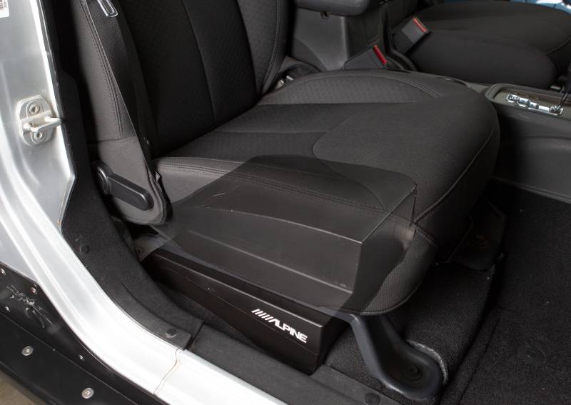 Alpine designed the SBV-10-WRA as a pre-loaded subwoofer enclosure that can be pressure fit under the front passenger's seat rails of your Jeep Wrangler without mounting hardware.\nThe SBV-10-WRA captures the lower frequencies of your music to draw out the bass and drum instruments for the impact you can feel in your chest.\nInstalled under the passenger's seat not only saves space, it optimizes the bass extension for deep, impactful bass performance.\nThe SBV-10-WRA will still perform in the rain, thanks to the weather-resistant, sealed enclosure.\nThe subwoofer's impedance and power rating ensure maximum output from Alpine's KTA-30MW Mono Tough Power Pack Amplifier (sold separately). The KTA-30MW is compact for stealth installation in a glove box or under a seat and is weather-resistant for powerful, reliable performance with your SBV-10-WRA.