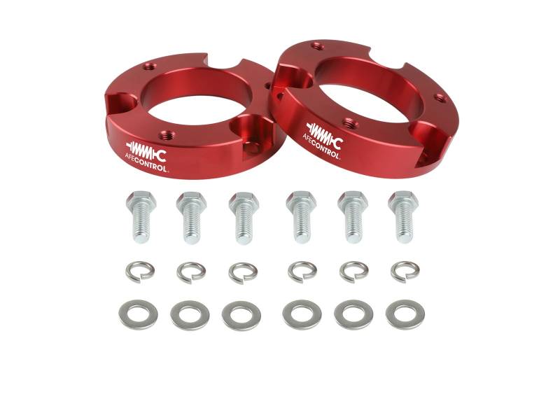 aFe CONTROL Leveling Kits are made of 6061 billet aluminum and provide a 2.0-Inch lift in the front to provide better off-road performance while also eliminating the “nose-down rake” notorious on stock trucks. High quality hardware is used for strength and durability. Installation of these 2.0-inch leveling spacers can be done at home with the proper tools and safety precautions. Installing these spacers does not require disassembly of the strut/spring.