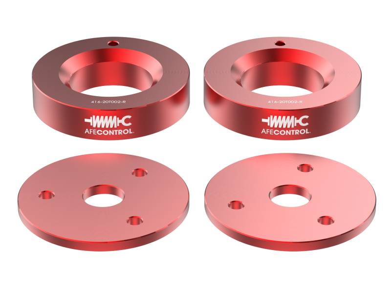 aFe CONTROL Leveling Kits are made of billet aluminum and provide an adequate lift to the front of your vehicle to improve off-road performance while also eliminating the “nose-down rake” from the factory stance.High quality hardware is used for strength and durability. New connecting rods are included to reposition the front ride height sensors so all driving modes remain available. Polyurethane spring isolators allow the top plates of the OE shocks to be switched in order to prevent the springs from bowing. Installation of these leveling spacers can be done at home with the proper tools and safety precautions. Installing these spacers does require disassembly of the strut/spring. A spring compressor is not required due to the light amount of preload on the stock coil springs and extended shaft studs.