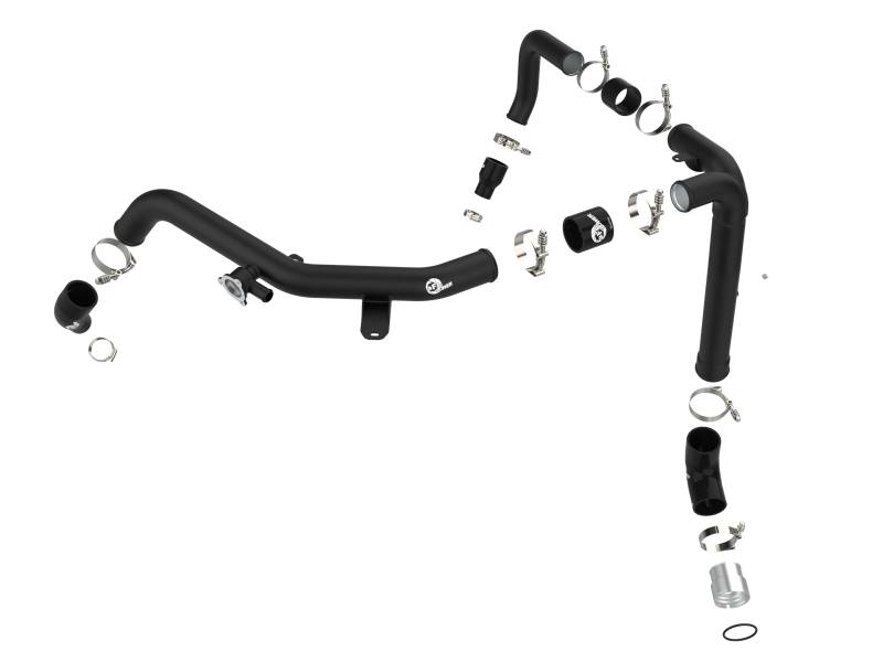 Smooth transitions in the mandrel-bent aluminum pipe decrease turbulence and minimize pressure loss, increasing horsepower and torque. This kit includes high-quality, stainless-steel, spring-loaded T-bolt clamps and heavy-duty, 5-ply, polyester reinforced silicone couplings. This charge pipe kit features factory style billet aluminum quick-connect adapter with an O-ring to ensure a leak-free fit while maintaining superior strength and durability. Finished in wrinkle black powder coating with a unique laser-etched aFe power logo for a custom look.