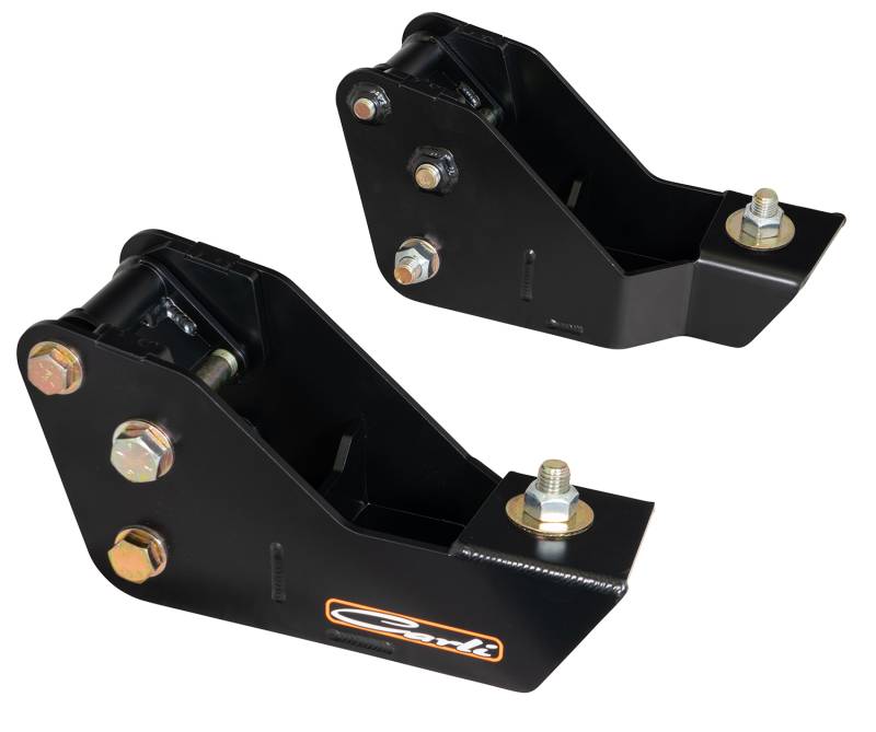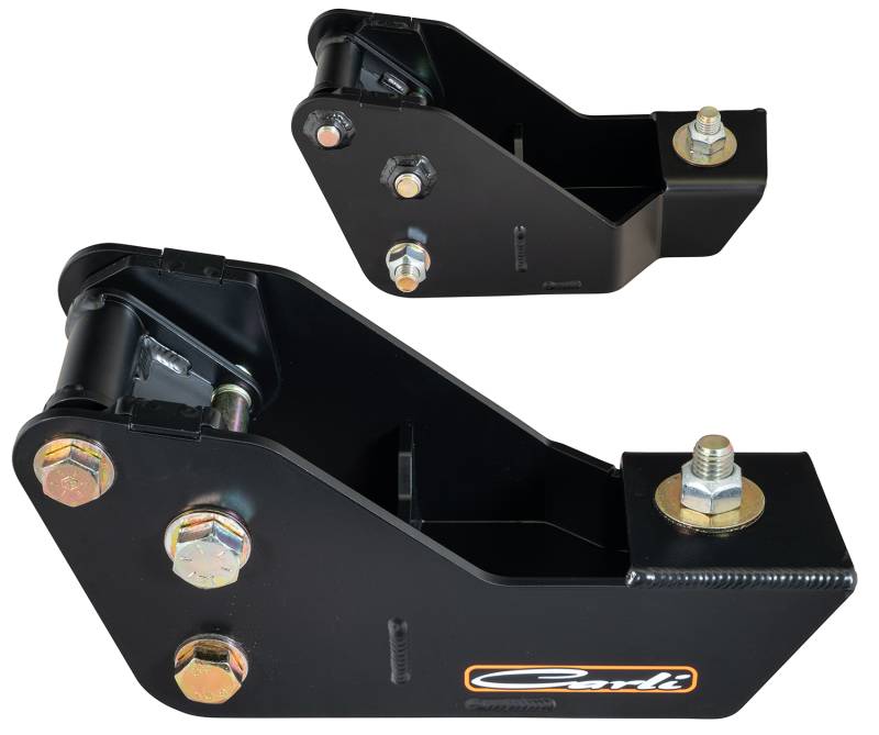 Designed for perfect fitment on the updated 2023+ Ford Superduty trucks, these drops will correct geometry with 3.5" lifts.\nThe 2023+ Super Duty introduced some new challenges, specifically pertaining to caster. The steering assist and Ford’s 1° – 3.6° allowable caster range seems to work alright for those equipped with stock, relatively low-mileage Super Duties but, once a lift or oversized tire enters the equation, the handling at this low caster specification leaves us wanting.\nWhen lifting the front of the Super Duty 3 – 3.5″, the factory caster is reduced by approximately 1.5°. For the 2020-23 Super Duty, we provide a 2° caster shim which is enough to restore this caster and add a touch more – unfortunately, this “touch more” is rarely enough for proper tracking. This leaves us recommending our Adjustable Radius Arms proven to add an additional 2.5° of caster (when maxed). Combining the Carli Arms and 2° shims results in a Super Duty on 37″ tires that holds a lane, and returns to center after a turn, better than a stock truck.\nEnter the 2024 Super Duty – Ford made ONE change to the platform… They added an outer axle-mounted guard to prevent debris from entering the outside axle tube. The issue is in the functionality of the ball-joint mounted caster shims we provide in our 05-23 Super Duty Systems to correct the caster. These shims don’t affect the axial position of the axle, but rotate the knuckle/upper ball joint position rearward relative to the axle’s outer “c” to increase caster.\nGiven the tight proximity of this debris shield to the axle tube, any caster shim over 1° will cause contact. Unfortunately, these trucks come with low caster from the factory compounded by the loss of caster from lifting the truck (radius arms tilt the axle forward – reducing caster – as the axle travels away from the frame); we had to figure out a solution.\nThe Carli Radius Arm Drops for 3.5" lifts were designed to fix this problem once and for all. The bolt-on design is a simple and easy installation that will provide the necessary increase in caster at a lower price point than installing the full Carli Radius Arm System and are compatible with stock OR the Carli Adjustable arms.