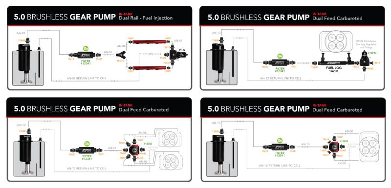 The market leader in fuel delivery systems and components, Aeromotive introduces its first brushless fuel pump series. The 5.0 Brushless Stealth Pump, the flagship of Aeromotive electric fuel pumps, yields 5 gallons per minute at 13.5-V and 40-PSI.? Built for up to 90 psi of sustained pressure, this new pump features our integral, internal Spur-Gear pumping mechanism which allows for higher pressures with minimal drop in flow.? Aeromotive is proud to offer this new 5.0 Brushless Stealth Pump, which is the single, highest flowing electric fuel pump available on the market today. Brushless motors employ sensors to monitor rotor angle to provide faster and more reliable phase shifting, producing more torque capacity and motor efficiency.\nAeromotive Inc. is a true high performance aftermarket manufacturer specializing in fuel delivery and fuel delivery components. Utilizing aerospace tolerances and procedures, three generations of track experience, and a meticulous approach to engineering, Aeromotive Fuel Systems has become the absolute pinnacle of performance fuel delivery.\nInstead of the armature rotating, in a brushless motor the magnets rotate around the armature and the motor controller manages the phase shift to keep the motor rotating under load (load is related to pressure in a fuel pump).?With more torque per watt and a higher torque to weight ratio, brushless motors produce lower noise and deliver higher reliability. With a higher level of efficiency, down to fractions of a second in design speed control, the new Aeromotive brushless fuel pumps provide precise control of fuel pump RPM as pressure rises, better maintaining pump RPM and flow, producing a flatter flow curve.? Tight tolerances result in less current draw, less heat and extended life. Now there is the ability to upgrade to a premium brushless pump for faster, more reliable and uninterrupted fuel delivery with less power consumption and potential for wear or failure. ORB-10 outlet port. ORB-12 inlet with integrated pickup and 100-m pre-filter. Direct fit for all Aeromotive Stealth Fuel Cells, 6, 15 and 20-gallon. For EFI applications use regulator P/N 13134 or P/N 13110. For carbureted applications use regulator P/N 13202 or P/N 13212. Capable of 90-PSI continuous operating pressure, 150 PSI peak pressure, base plus boost. Fully submersible for custom, in-tank placement. Perfect for ?blow-through? carbureted engines up to 2,700 FWHP (race gas). Upgrade your standard brushless pump to make it True Variable Speed by buying the 18047 retrofit kit cap.