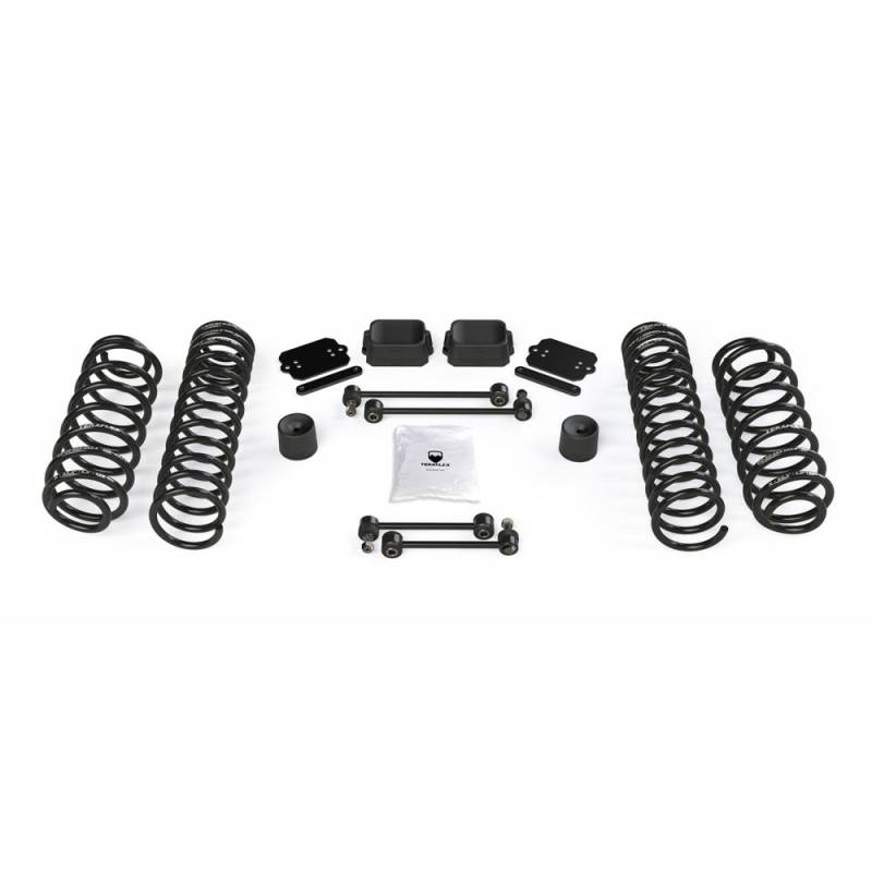 The TeraFlex JL 2dr: 2.5" RT2 Coil Spring Base Lift Kit includes just the basic lift components only and doesn’t have the drivability of a full suspension system. Requires adjustable control arms and adjustable front track bar to correct suspension geometry.