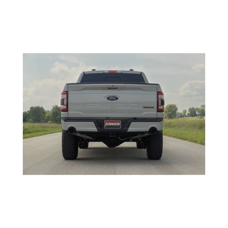 This Flow FX cat-back exhaust system is for the 2021-2025 Ford F-150 trucks with the standard 2.7, 3.5, and 5.0-liter and PowerBoost 3.5L engines that are equipped with the optional dual exhaust out the rear bumper. This exhaust offers a deep throaty exhaust note with aggressive to moderate sound levels both inside and outside of the truck, with all the performance benefits that you would expect from Flowmaster. This bolt-on emissions-legal system features all mandrel-bent 409 stainless steel 3.00-inch tubing that flows into a FFX straight through muffler and exiting into large 3.00-inch dual tailpipes for maximum sound and performance. The system exits the OEM rear bumper cut outs and uses all the factory hanger locations. The tailpipes are finished off with a pair of large 4.50-inch black ceramic-coated stainless-steel tips for a more aggressive look than the factory tip. This exhaust system is covered by our Lifetime Limited Warranty. Designed for an easy fit, this system includes all necessary parts and hardware for installation.