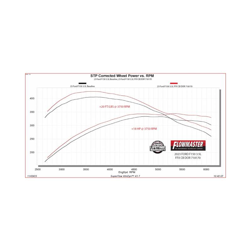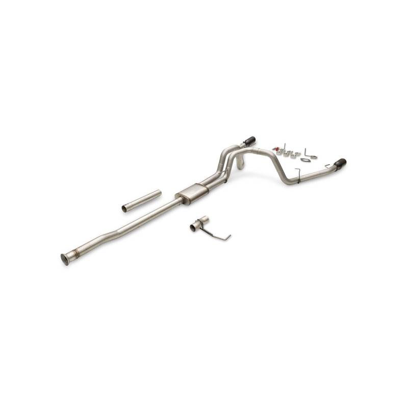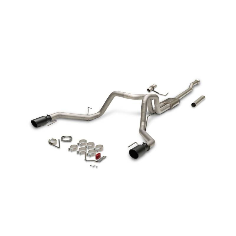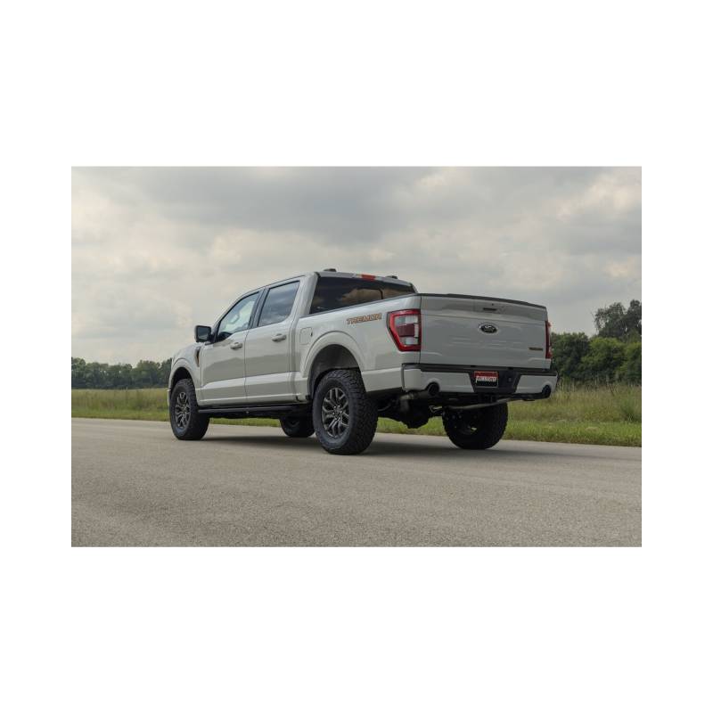 This Flow FX cat-back exhaust system is for the 2021-2026 Ford F-150 trucks with the standard 2.7, 3.5, and 5.0-liter and PowerBoost 3.5L engines that are equipped with the optional dual exhaust out the rear bumper. This exhaust offers a deep throaty exhaust note with aggressive to moderate sound levels both inside and outside of the truck, with all the performance benefits that you would expect from Flowmaster. This bolt-on emissions-legal system features all mandrel-bent 409 stainless steel 3.00-inch tubing that flows into a FFX straight through muffler and exiting into large 3.00-inch dual tailpipes for maximum sound and performance. The system exits the OEM rear bumper cut outs and uses all the factory hanger locations. The tailpipes are finished off with a pair of large 4.50-inch black ceramic-coated stainless-steel tips for a more aggressive look than the factory tip. This exhaust system is covered by our Lifetime Limited Warranty. Designed for an easy fit, this system includes all necessary parts and hardware for installation.