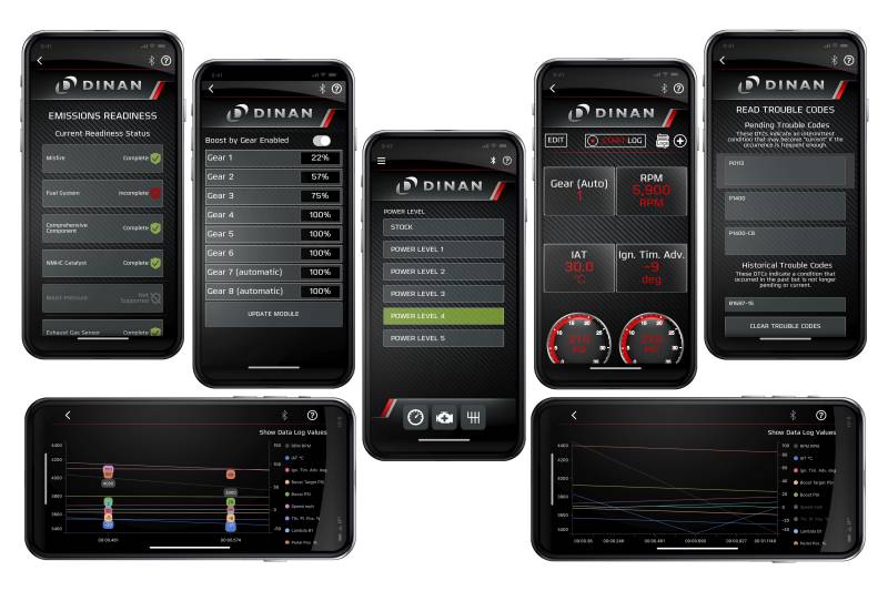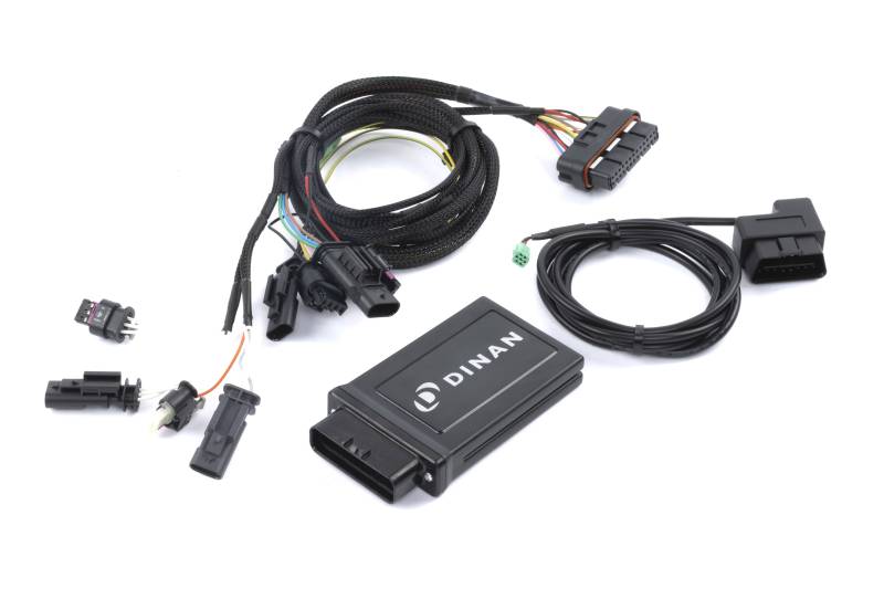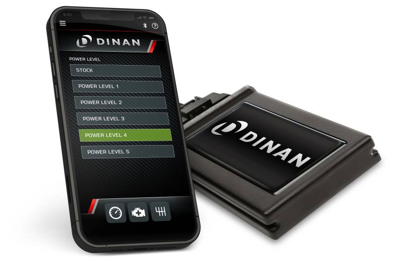 Developed wholly from the ground up. Engineered, calibrated and made all in America - This is not the competitions product.\nThe Dinan Power Control Unit (PCU) is an evolutionary step in Dinan in-line tuning modules based off over a decade of lessons learned in the category. At its core the PCU is similar to its precursors and installs in between select sensors and the ECU, adjusting these signals in order to achieve increased performance the stock programming is unable to approach. However, what sets the PCU apart is its integration into more than just the fundamental boost sensors but also additional connections -- inclusive of OBDII. The result is a more capable system that can do so much more than just increase power. Live monitoring of vehicle health via logging, customizable gauges, and code reading/clearing, among others, are now possible ensuring a seamless tuning experience even a novice can be comfortable with.\nThe Dinan PCU is controlled by a free Bluetooth app, available for both iOS and Android, and is home to all the potent features the device offers. Equipped with 5 different pre-set performance levels, in addition to stock, you can choose to select your desired output and enjoy more power for a true install and forget experience, or you can opt to engage in the more advanced features at your fingertips. Boost by gear customization, as an example, allows you to limit power delivery as you see fit in lower gears ensuring optimum traction and a perfect launch. Where the PCU shines however is in data acquisition and monitoring that gives insight into the vehicles overall health and makes certain your tuned vehicle is always running at peak potential.\nSafety and reliability have been cornerstones of the Dinan brand for generations and not only does the Dinan PCU not hinder any factory safeguards or emissions controls but incorporates its own safeties as well. Going one step beyond our own internal protections, the PCU also grants the end user the ability to monitor up to 20 different engine parameters in real time via customizable in-app gauges for verification of worry-free operation. Those same parameters can also be logged/viewed in app (or exported to CSV) for further scrutiny if desired.\nAll told, the Dinan PCU delivers more power and more features with improved reliability and drivability than ever offered before. Performance without sacrifice is alive and well!