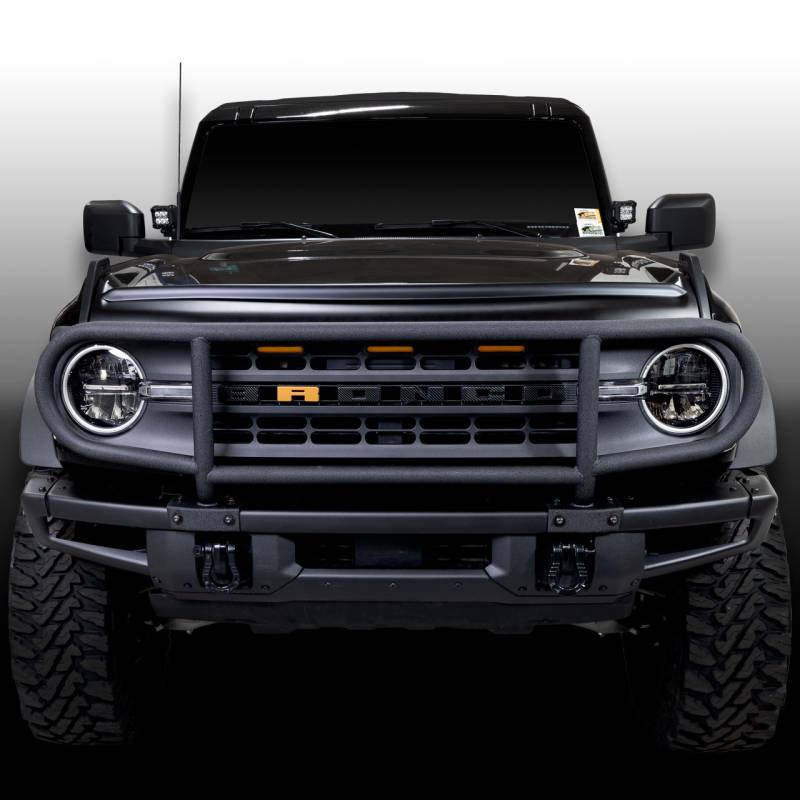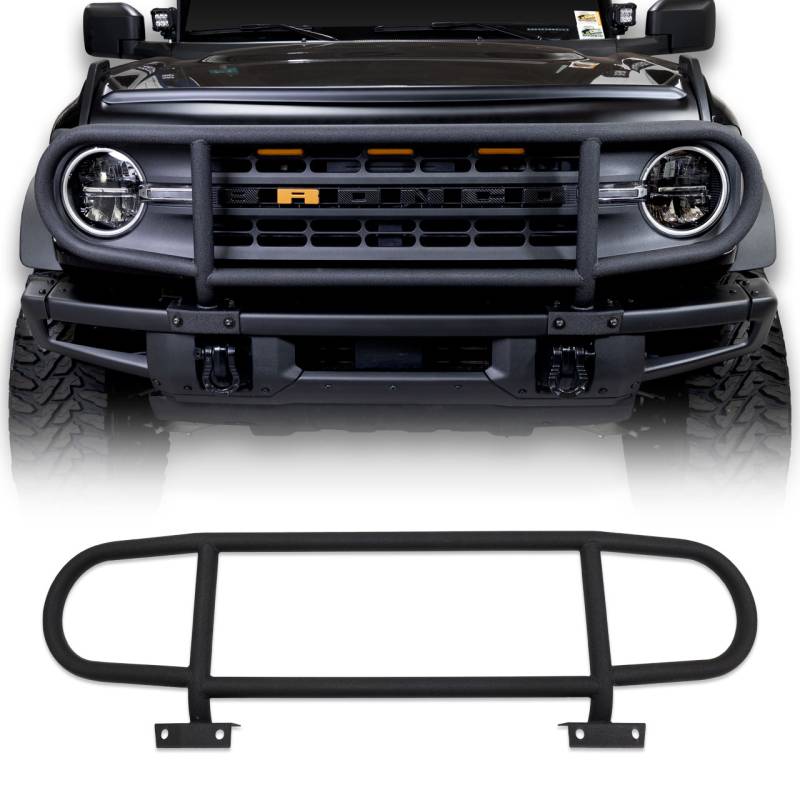 IAG I-Line Tall Bull Bar The IAG I-Line Tall Bull Bar is designed to enhance the appearance of your Bronco, but also add a measure of front end protection against off-road debris. The bull bar features heavy-duty steel construction and covers the front grill area of the Bronco, including around the headlights. Designed to perfectly fit the OEM modular front bumper. Protect your front end against damage from brush and debris.