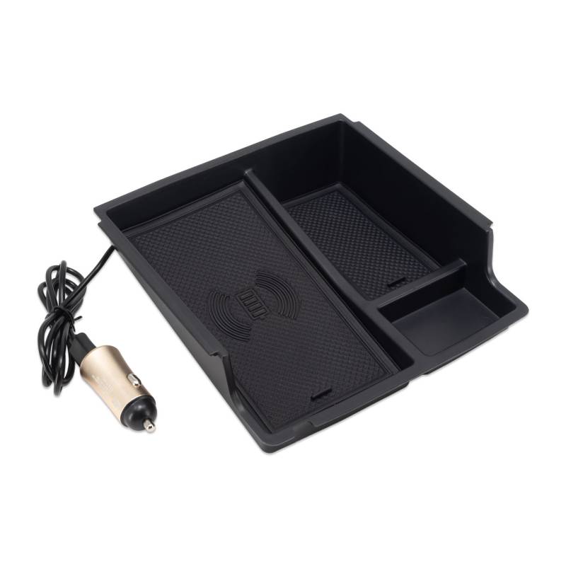 IAG I-Line Armrest Organizer with Wireless Charging Pad The IAG I-Line Wireless Charging Armrest Organizer provides a secure place to charge your phone and store everyday items such as cards, wallets, cell phones, chargers, coins, etc. Your phone stays out of sight inside the center console while charging. The pad provides up to 15W of wireless charging power and installs easily without any custom wiring. Just plug the tray into the existing USB port or cigarette lighter port in the console. Features a passthrough for charging cables.
