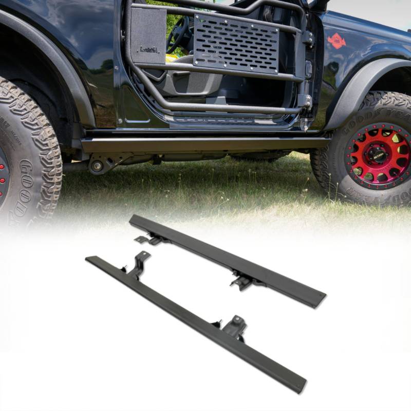 IAG I-Line Factory Style Rock Rail The IAG I-Line Factory Style Rock Rails for 2 Door Broncos provide a barrier of dependable protection for your Bronco’s lower rocker panels, doors and pinch weld seams. Avoid damage caused by truck slips and rough terrain, and let these rugged Rock Rails absorb the impact, or slide right over rough surfaces. The I-Line Factory Style Rock Rails give you protection where you need it for a fraction of the price of the OEM version. Tough enough to keep away corrosion and scratches. Designed to mount to your Bronco’s OEM rock rail mounting locations.