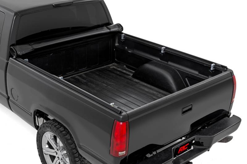 All-Weather Bed Protection: Rough Country's Soft Roll-Up Bed Cover delivers reliable protection against the elements while preserving full bed functionality. Constructed from high-quality, marine-grade vinyl with a sleek matte black finish, this durable cover features heavy-duty hook-and-loop side seals and tight front and rear barriers to shield your cargo from rain, dust, and debris.Streamlined Low-Profile Design: Sitting just 1-1/8" above the bed, this top-mount cover blends seamlessly with your truck's lines for a clean, stylish look. The corrosion-resistant, black powder-coated aluminum frame offers long-lasting strength without sacrificing style or aerodynamics.Fast and Easy Bed Access: The roll-up design and spring-latch closure system make opening and closing the cover a breeze. A single cable pull lets you release the latch quickly, giving you fast access to your full bed whenever you need it. Whether you're hauling gear or unloading tools, convenience comes standard.Effortless Installation: No drilling required - this cover installs in just 20 minutes using the included bracket system and tools. It mounts securely to your factory bed rails for a snug, hassle-free fit you can count on.Protected by a 5-Year Warranty: Rough Country backs this Soft Roll-Up Bed Cover with a 5-Year Replacement Warranty, protecting against structural and workmanship defects so you can hit the road with total confidence.