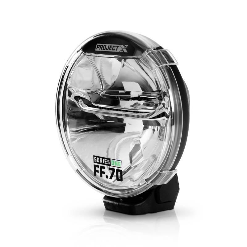 SERIES ONE FF.70 - FREE FORM 7 INCH LED AUXILIARY LIGHT - FLOOD BEAM Connect with the Wild with the Project X - Series One Free Form LED auxiliary lights. The Series One utilizes enhanced free form optics to capture and focus more of the light generated from the LEDs to produce a greater penetrating light output down the road, eliminating wasted light and focusing the beam where you need it most. Available in both Spot and Flood beams. Powered by Cree - The very latest in Cree XHP50.2 LED chip sets produce an extremely efficient yet powerful white light output (5000K) HID Performance in LED Package - 3,800 raw lumens (1,663 effective) per light Superior Optics - Enhanced free form optics capture and focus more of the light generated from the LEDs to produce a greater penetrating light output down the road, eliminating wasted light and focusing the beam where you need it most LED Front Position Light Pipe - Signature built-in LED light pipe meets ECE requirements for front position light improving daytime driving visibility and safety Customizable Appearance - Customize the look of your Series One FF.70s with your choice of 2 glare shield caps in Black or Project X Green