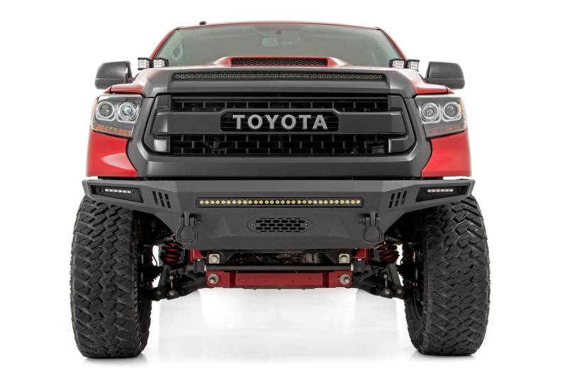 High-Clearance Protection Built for Real-World Abuse: Give your third-generation Toyota Tundra the strength and clearance it needs with Rough Country's High-Clearance Front Bumper. Designed to improve approach angles while delivering serious front-end protection, this bumper combines aggressive styling with trail-proven functionality.Heavy Duty Steel Construction You Can Trust: Built with an 11 gauge steel main skin and a reinforced 7 gauge inner structure and winch tray, this bumper is engineered to withstand hard impacts, harsh terrain, and demanding recovery situations.Modular Design for a Customized Setup: The fully modular configuration allows you to build the bumper that fits your needs. Run it clean with included block-off panels or configure it with lighting and recovery equipment for dedicated off-road performance.Integrated Recovery Points for Confident Pulls: Equipped with heavy duty recovery points designed to accept standard 3/4 inch D-rings with 7/8 inch pin diameter, ensuring dependable strength when vehicle recovery is required.Optimized Lighting Options for Maximum Visibility: Designed to accommodate 6 inch slimline LED lights in the wings and an optional 30 inch Black Series LED light bar in the center, providing powerful illumination for night driving, trail runs, and worksite conditions.Winch-Ready for Serious Recovery: Integrated winch tray is precision engineered to accept Rough Country PRO9500 or 12,000lb synthetic rope winches, delivering reliable recovery capability when terrain gets unpredictable.Purpose-Built Clearance for Off-Road Performance: The high-clearance profile improves approach angles and ground clearance, allowing your Tundra to tackle obstacles with greater confidence both on and off the trail.Backed by Rough Country's Limited Lifetime Replacement Warranty: Rough Country stands behind its products with dependable coverage. LED lights are backed by a 3 year warranty, the bumper finish carries a 1 year warranty, and the bumper itself includes a limited lifetime warranty against manufacturing defects for long-term peace of mind.