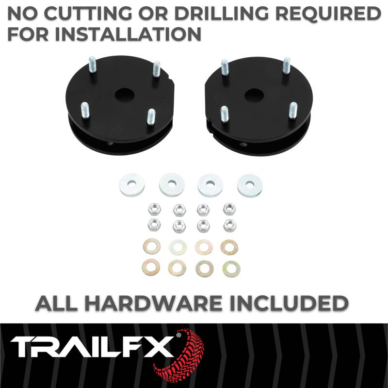2 Inch Lift Engineered for durability and reliable performance, without sacrificing ride quality. TrailFX leveling kits allow you to level or slightly lift your vehicle for improved stance or additional tire clearance. Kits come complete with spacers and installation hardware and no drilling or cutting is required. Buy confidently with a limited lifetime warranty. Engineered To Eliminate Ball Joint, Tie Rod And Steering Bind Does Not Required Permanent Modifications To Factory Parts, No Cutting Or Drilling Required Will Align To Factory Specification Powder Coated Steel For Maximum Corrosion Resistance Includes All Components Needed To Properly Install The Leveling Kit