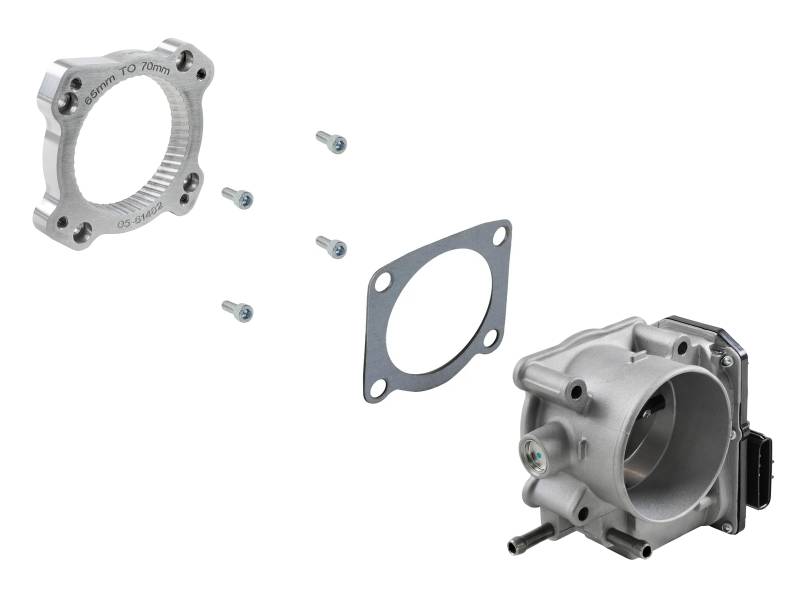 This aFe POWER 70mm Throttle Body and adapter kit improves engine air flow over the stock 65mm throttle body. The extra air flow will increase horsepower and throttle response. Performance gains will be more noticeable as more upgrades are added to the vehicle. All adapters are constructed from 6061-T6 billet aluminum and are precision machined for light weight, high strength, and perfect fit and finish. The Serrated/Swirl combination design creates intake turbulence in the combustion chamber which breaks up the fuel creating a more complete combustion cycle increasing horsepower, torque and improving throttle response. This aFe POWER 70mm throttle body kit uses all factory mounting locations providing stability and a hassle-free installation. All needed hardware is included with the kit. It is recommended to install this throttle body kit with an aFe cold air intake.