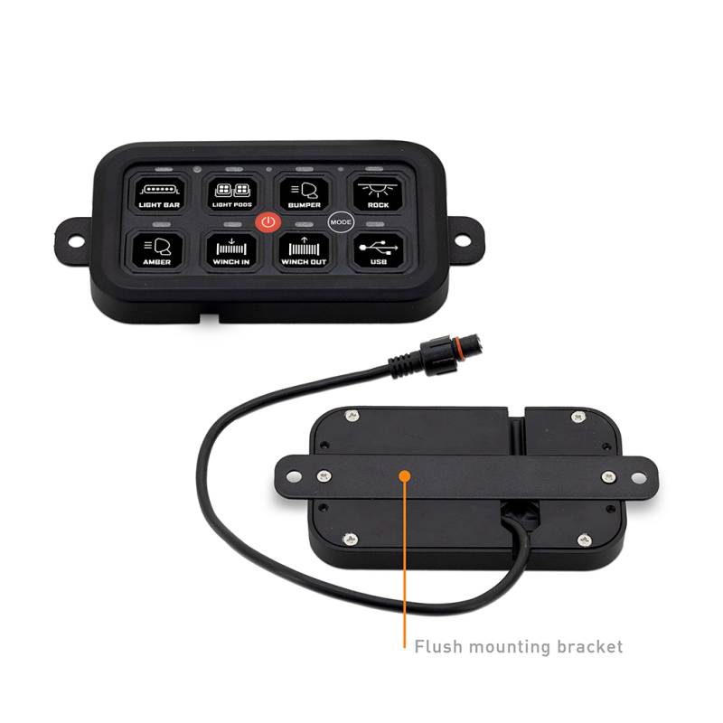 -- Optimize your setup based on your needs with three available switch modes: toggle, momentary, and pulsed. The integrated low-voltage cut-off (LVCO) system protects your battery by preventing over-discharge, while four backup fuses offer additional peace of mind. Personalize your setup with 100 included button labels and enjoy a hassle-free installation with all necessary hardware and wiring included. Backed by the Borne Off-Road Lifetime Warranty, this switch control panel offers the best reliability, functionality, and style in one complete package. Control up to eight accessories, including Borne Lighting and other compatible devices Features dimmable and color-changing RGB LED backlights Offers versatile mounting options with both flush mount and adjustable bracket configurations for universal compatibility