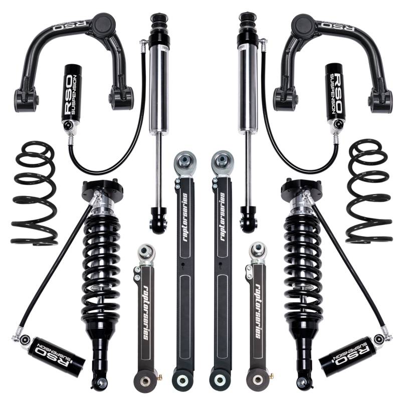 RSO Suspension 2-3 inch Stage 4.0 Lift Kit - 10-23 Toyota 4Runner The RSO Suspension Stage 4.0 lift kit for the Toyota 4Runner is the top choice for the serious off-roader looking to enhance performance, adjustability and articulation on their trail vehicle. Constructed with the highest quality materials to increase ground clearance and counteract heavier bumpers and gear. Aggressive damping performance by utilizing large 2.5in adjustable remote reservoir coilovers and shocks help your 4Runner take on any obstacle. Billet aluminum front upper control arms with FK Rod Ends heims and unibals are stronger and lighter than the factory arms while allowing on the vehicle caster and camber adjustments. Adjustable billet aluminum rear upper and lower links let you properly set your pinion angle and greatly increase suspension flexibility. New rear coil springs lift the rear, optimized spring rates improve comfort on the trails while carrying all your gear. Precision machined materials with industry leading coatings ensure long life and corrosion free performance on any terrain. At RSO Suspension, we take pride in offering only the highest quality products for your offroad vehicle. Constructed with the highest quality materials to increase ground clearance, eliminate sagging and counteract heavier bumpers and gear Aggressive performance from large 2.5in adjustable remote reservoir coilovers and shocks Billet aluminum front upper control arms with FK Rod Ends heims and unibals are stronger and lighter than the factory arms while allowing on the vehicle caster and camber adjustments Adjustable billet aluminum rear upper and lower links let you properly set your pinion angle and greatly increase suspension flexibility. New rear coil springs with optimized spring rates improve comfort on the trails Precision machined materials with industry leading coatings ensure long life and corrosion free performance on any terrain