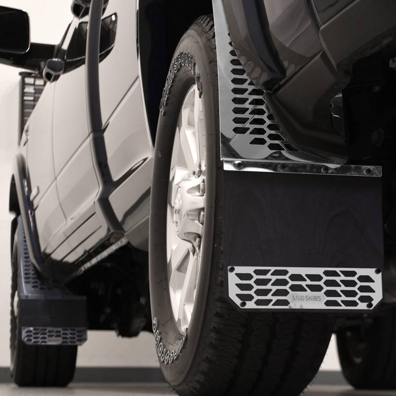 Protect your fenders from debris with our stainless steel Hex mud skins. These units are the perfect blend of style and protection for your truck from rocks, mud, snow, and anything the elements can throw at you and your ride. Choose from a front pair, rear pair, or a full set of mudflaps.These American-made mud flaps are constructed out of heavy-duty quarter-inch rubber that is held to your truck with 18 gauge stainless steel. We offer them in polished stainless steel or brushed stainless steel. These Hex mudguards are also great for any truck that has oversized tires because of their offset design. Installing our hex shield mud skins is easy with no drilling and all mounting hardware included. So if you are looking for a one-of-a-kind style but want extra protection from debris, our Stainless steel Hex Mud Skins are perfect for you. Get these limited lifetime warranty mud flaps ordered today!