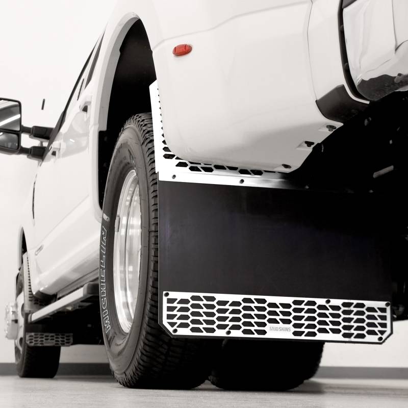 Protect your fenders from debris with our stainless steel Hex mud skins. These units are the perfect blend of style and protection for your truck from rocks, mud, snow, and anything the elements can throw at you and your ride. Choose from a front pair, rear pair, or a full set of mudflaps.These American-made mud flaps are constructed out of heavy-duty quarter-inch rubber that is held to your truck with 18 gauge stainless steel. We offer them in polished stainless steel or brushed stainless steel. These Hex mudguards are also great for any truck that has oversized tires because of their offset design. Installing our hex shield mud skins is easy with no drilling and all mounting hardware included. So if you are looking for a one-of-a-kind style but want extra protection from debris, our Stainless steel Hex Mud Skins are perfect for you. Get these limited lifetime warranty mud flaps ordered today!