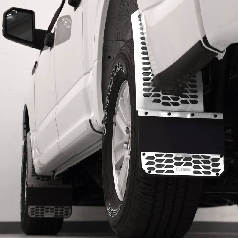 Protect your fenders from debris with our stainless steel Hex mud skins. These units are the perfect blend of style and protection for your truck from rocks, mud, snow, and anything the elements can throw at you and your ride. Choose from a front pair, rear pair, or a full set of mudflaps.These American-made mud flaps are constructed out of heavy-duty quarter-inch rubber that is held to your truck with 18 gauge stainless steel. We offer them in polished stainless steel or brushed stainless steel. These Hex mudguards are also great for any truck that has oversized tires because of their offset design. Installing our hex shield mud skins is easy with no drilling and all mounting hardware included. So if you are looking for a one-of-a-kind style but want extra protection from debris, our Stainless steel Hex Mud Skins are perfect for you. Get these limited lifetime warranty mud flaps ordered today!
