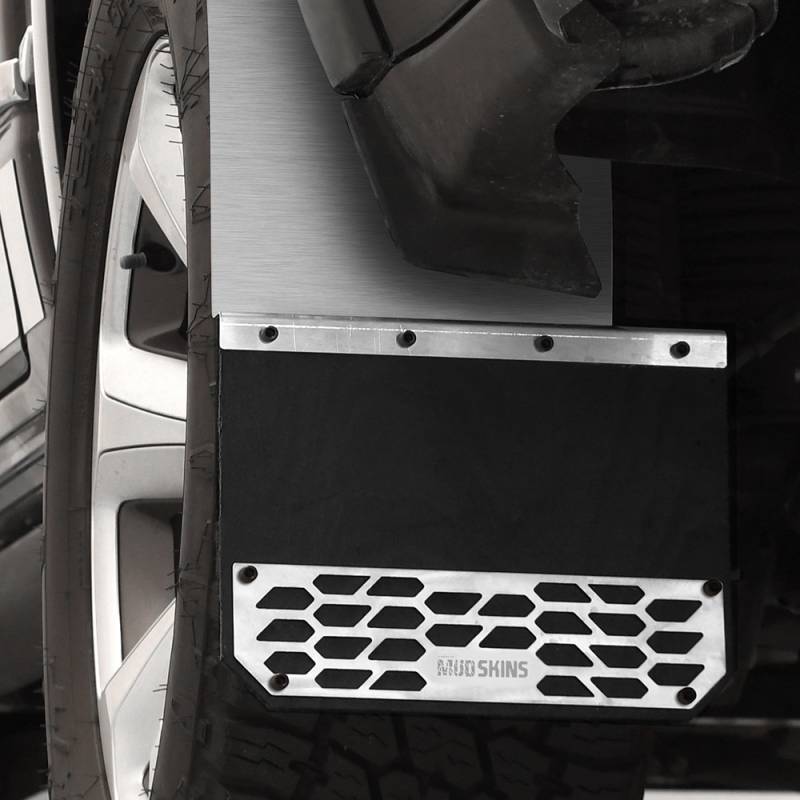 Protect your fenders from debris with Putco stainless steel Hex mud skins. These units are the perfect blend of style and protection for your truck from rocks, mud, snow, and anything the elements can throw at you and your ride. Choose from a front pair, rear pair, or a full set of mudflaps.These American-made mud flaps are constructed out of heavy-duty quarter-inch rubber that is held to your truck with 18 gauge stainless steel that you can get in polished stainless steel or brushed stainless steel. These Hex mudguards are also great for any truck that has oversized tires because of their offset design. Installing the Putco hex shield mud skins is easy with no drilling and all mounting hardware included. So if you are looking for a one-of-a-kind style but want extra protection from debris the Putco Stainless steel Hex Mud Skins are perfect for you. Get these limited lifetime warranty mud flaps order today!