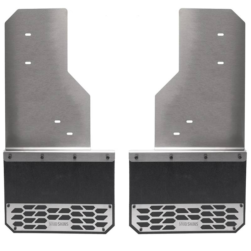 Protect your fenders from debris with Putco stainless steel Hex mud skins. These units are the perfect blend of style and protection for your truck from rocks, mud, snow, and anything the elements can throw at you and your ride. Choose from a front pair, rear pair, or a full set of mudflaps.These American-made mud flaps are constructed out of heavy-duty quarter-inch rubber that is held to your truck with 18 gauge stainless steel that you can get in polished stainless steel or brushed stainless steel. These Hex mudguards are also great for any truck that has oversized tires because of their offset design. Installing the Putco hex shield mud skins is easy with no drilling and all mounting hardware included. So if you are looking for a one-of-a-kind style but want extra protection from debris the Putco Stainless steel Hex Mud Skins are perfect for you. Get these limited lifetime warranty mud flaps order today!
