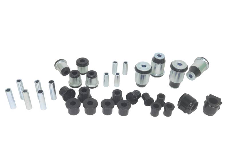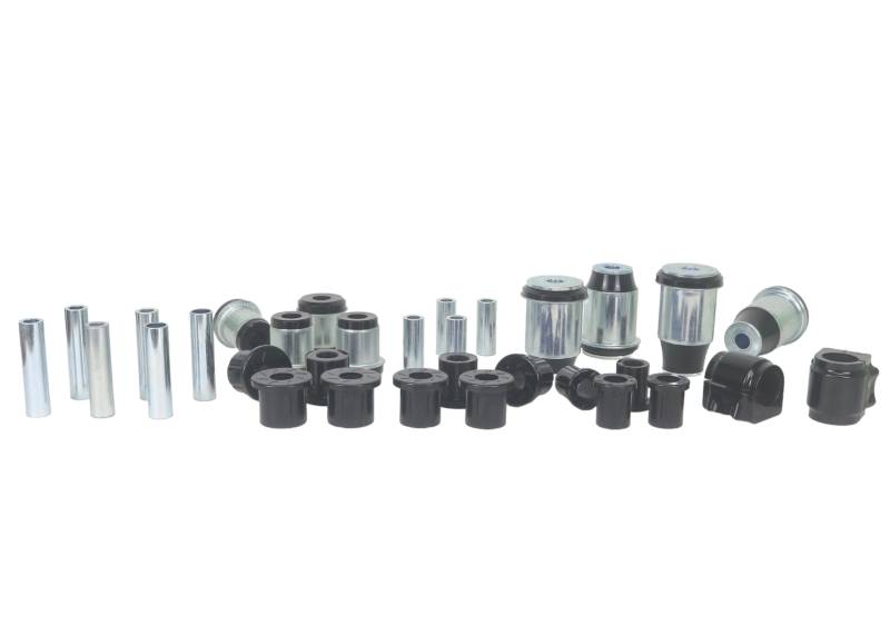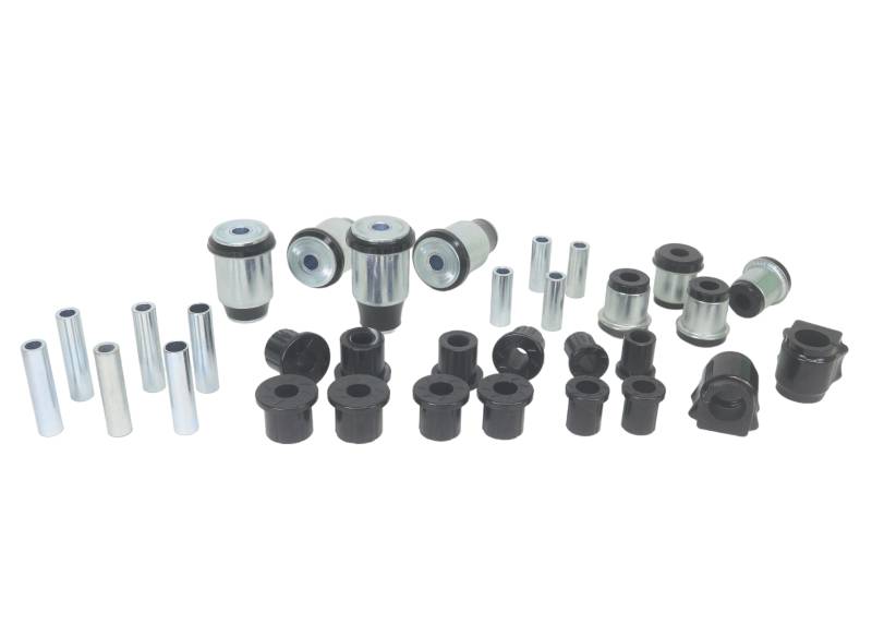 Nolathane's Master Vehicle Bushing Kit is a suspension overhaul and upgrade in one box.The kit includes:Front Upper Control Arm Inner BushingsFront Lower Control Arm Inner BushingsFront Sway Bar Mount BushingsRear Leaf Spring Fore and Aft Spring Eye BushingsRear Leaf Spring Shackle BushingsOffering a maintenance-free lifetime upgrade the Nolathane bushings also offer far superior performance with a more consistent alignment, improved and even tire wear, and greater consistency and predictability behind the wheel.Note a number of premium features unmatched by our competition:OEM style integrated steel outer shell: This allows for a precise and factory-fit installation with no margin for error.Nolathane's industry-leading polyurethane compounds combine with the best features of the design to offer a lifetime of performance, improved driving dynamics and on-road performance, with unmatched durability towing, hauling or off-road.OEM levels of NVH - Nolathane products are designed so you use and feel the performance; but do not have to hear it. Our proprietary polyurethane compounds keep road and tire noise to a minimum letting you soak up the miles in comfort and isolation on or off the pavement. peace of mind backed by the best in the bushing business!